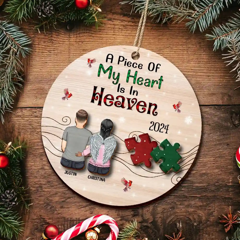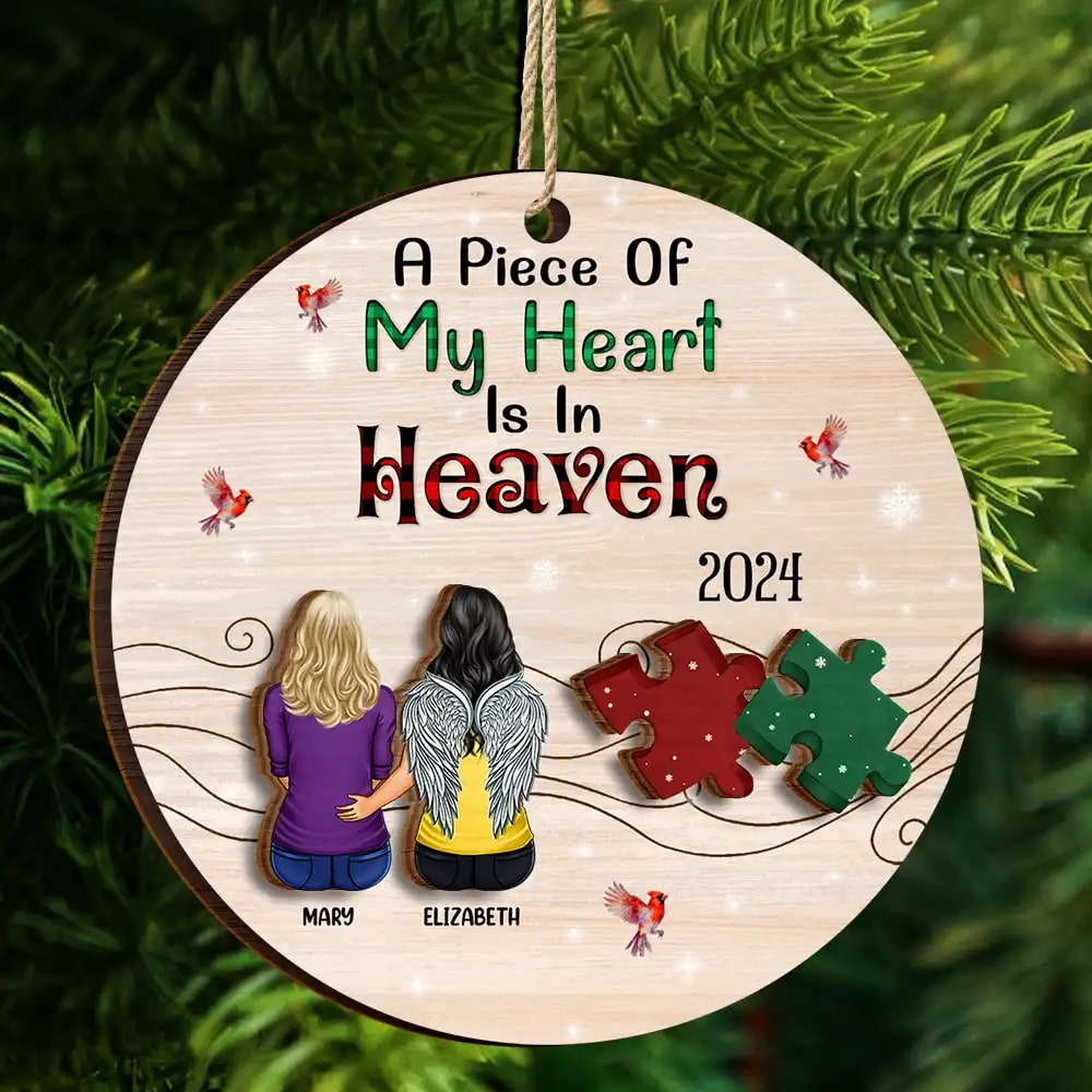 Honor a loved one’s memory with the A Piece Of My Heart Is In Heaven – Personalized 2-Layered Wooden Ornament, a meaningful memorial gift. This ornament is perfect for gift-giving for grandparents, grandpa, grandma, family, parents, father, mother, siblings, sister, brother, kids, daughter, son, and besties on Mother’s Day, Father’s Day, Thanksgiving, Christmas, birthdays, and anniversaries.