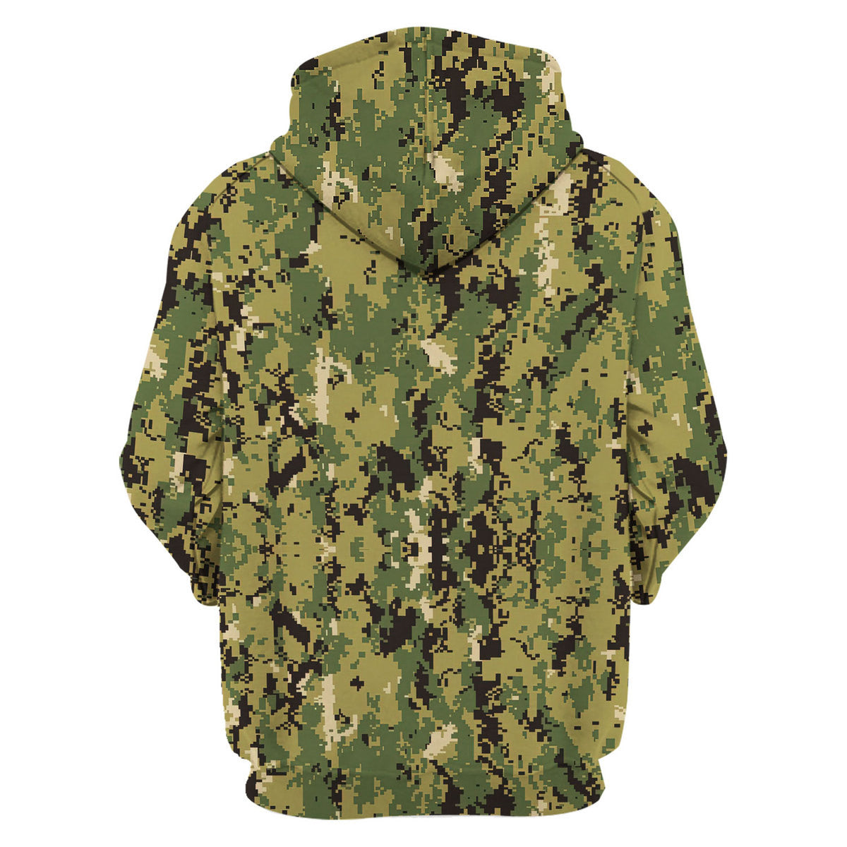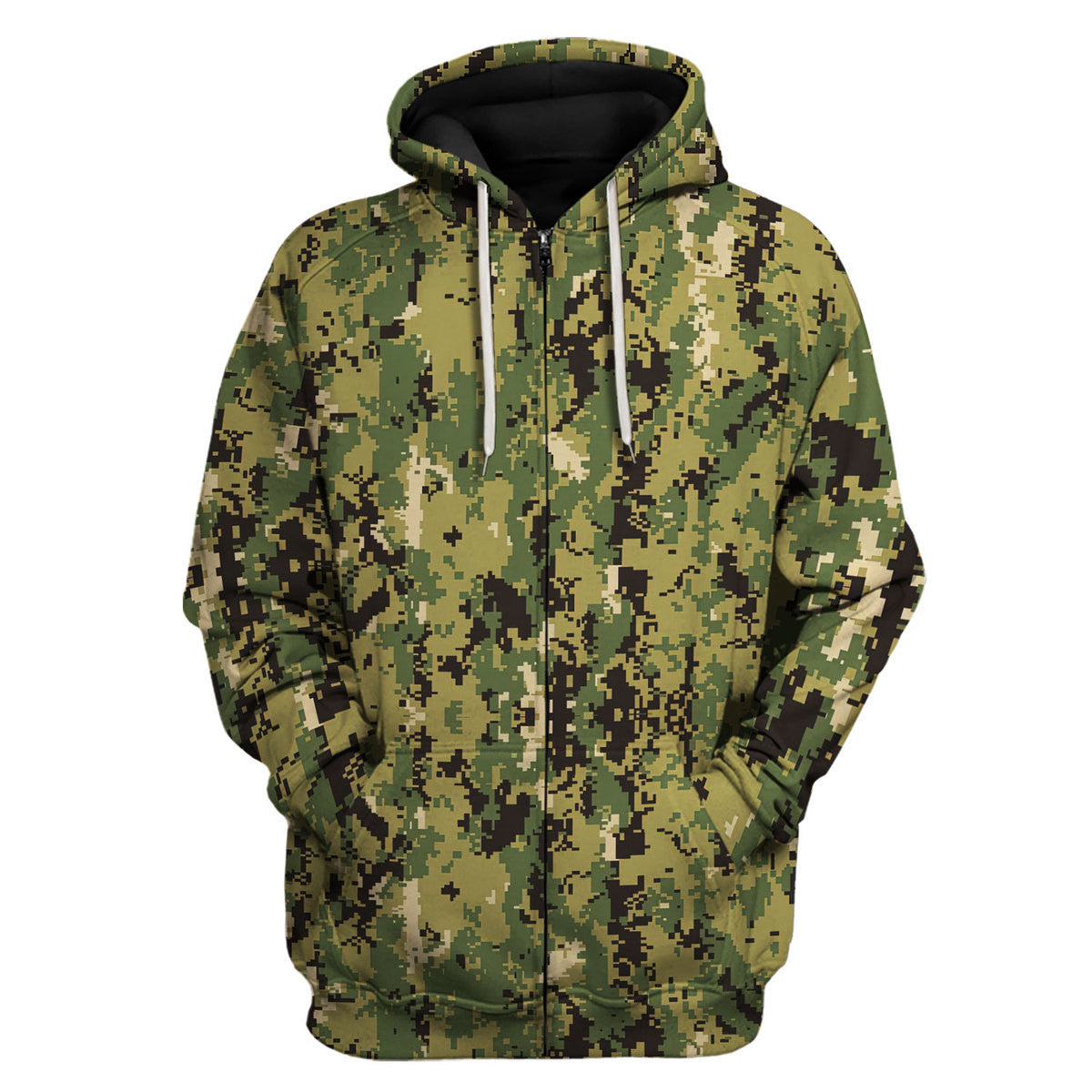 If you’re a lover of all-over-print apparel, the American Navy Working Uniform (NWU) Type III (AOR-2) Woodland Camo Hoodie Zip from The Halloween Smoke is the perfect choice for you. This unique piece makes for an exceptional gift, and with its customizable options, it allows you to showcase your personal style in a truly distinctive way.