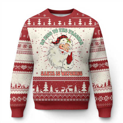 Be Nice To The Teacher Santa Is Watching Retro Groovy Ugly Christmas Sweater