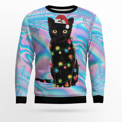 Black Cat Hologram Pattern Ugly Christmas Sweater