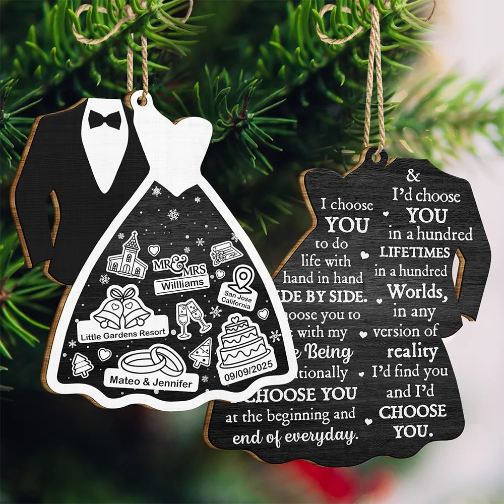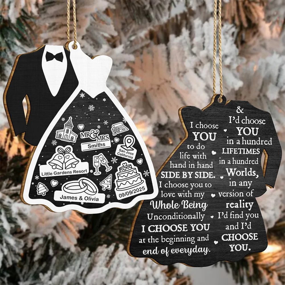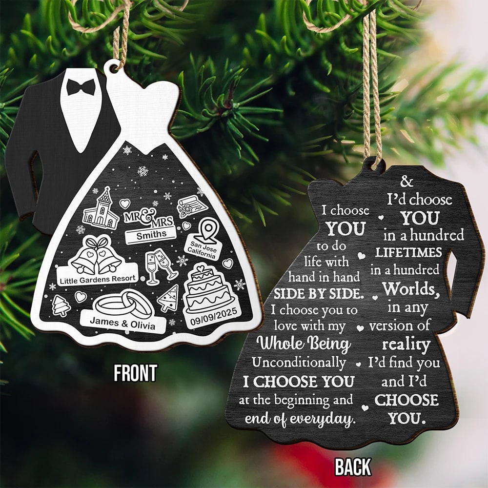 Celebrate your love story with the Bride & Groom I Choose You – Personalized Wooden Ornament Print 2 Sides. This meaningful gift for couples, husbands, or wives is perfect for Christmas, Anniversary, Valentine’s Day, Birthday, or even Thanksgiving. It brings a joyful and heartfelt touch to any romantic occasion.