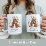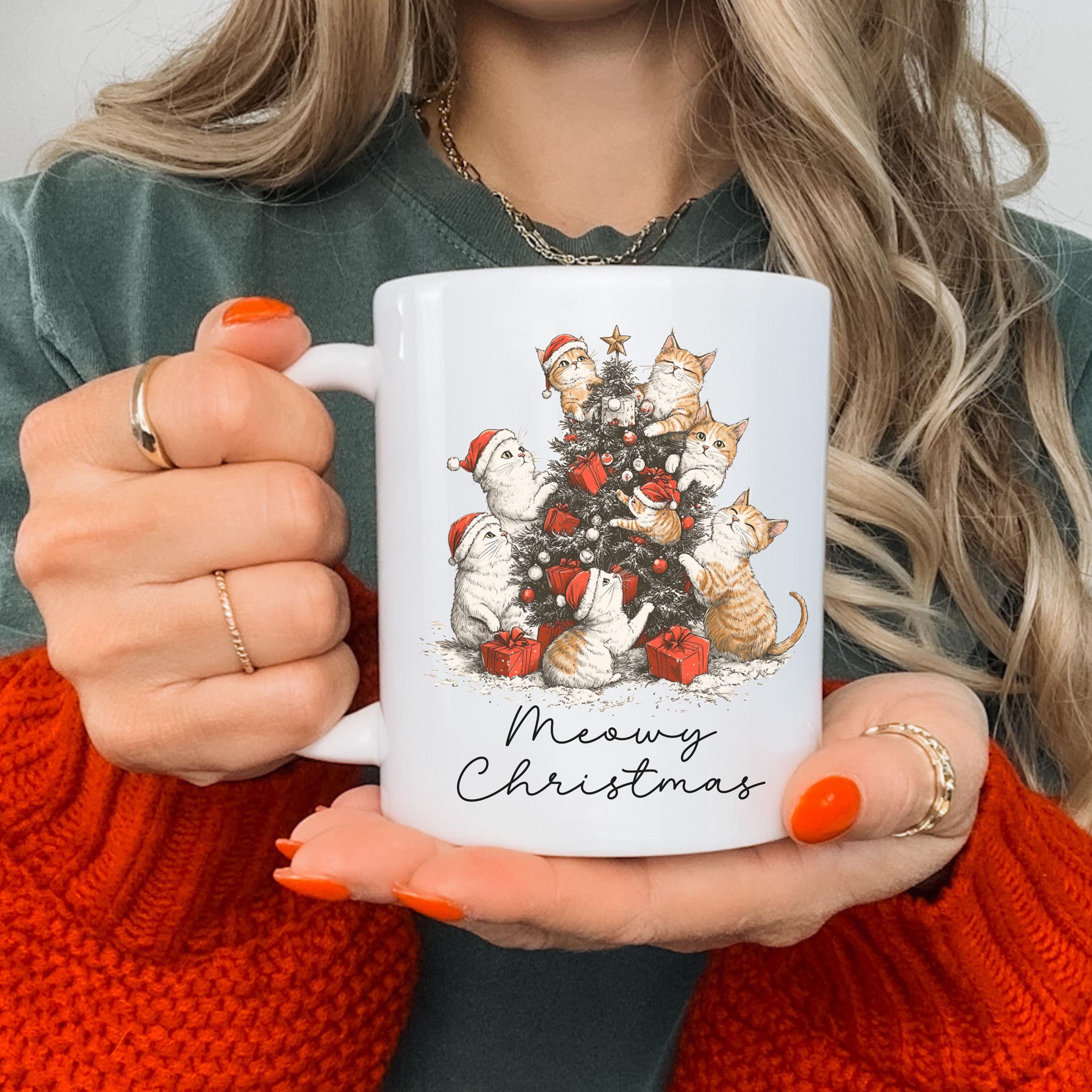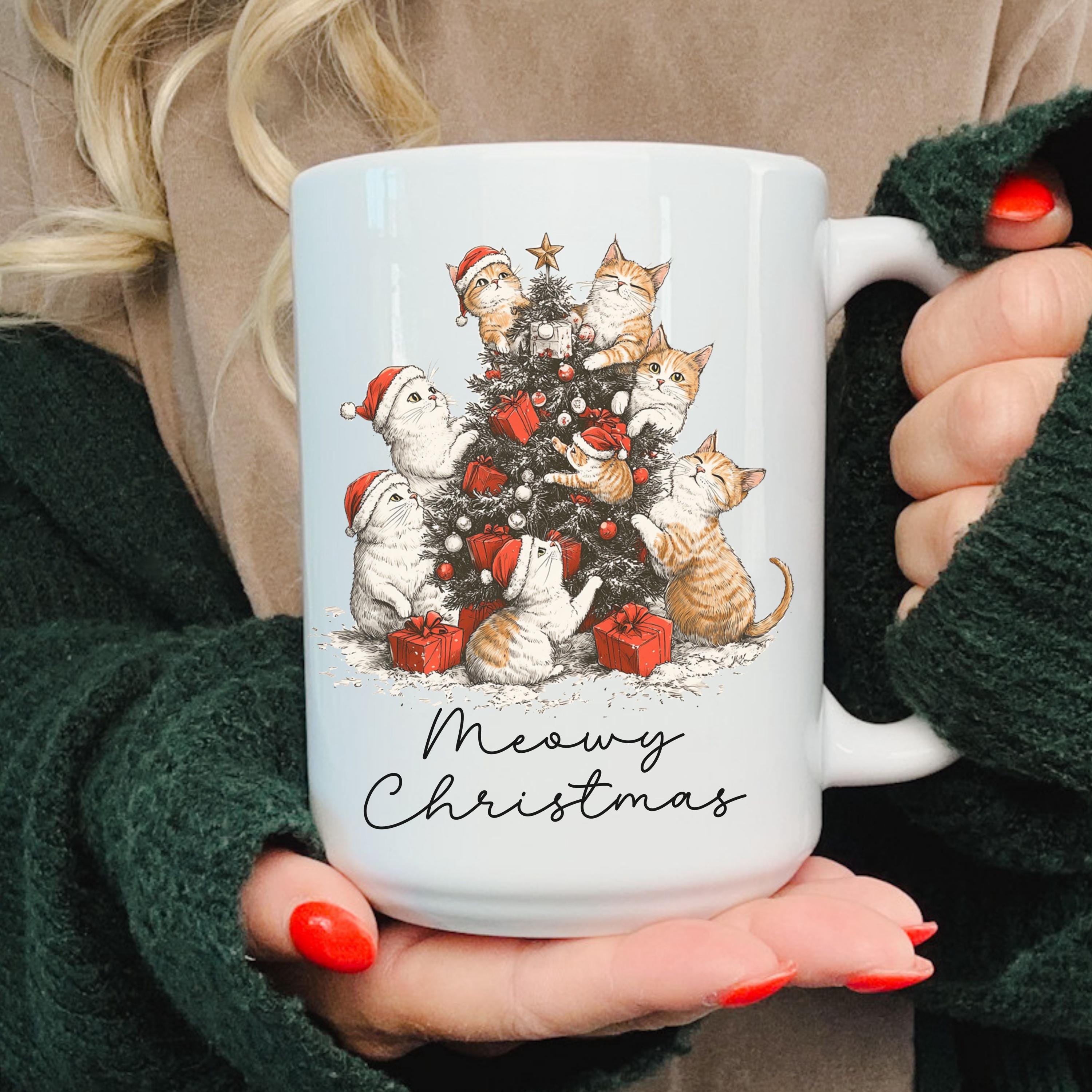 Adorable Cat Christmas Tree coffee mug, perfect for cat lovers. Features playful kittens climbing a festive tree. Available in 11 oz or 15 oz. Design is printed on both sides. Microwave and dishwasher safe. C-shaped handles. Ceramic with a glossy finish. Hand wash or dishwasher safe.