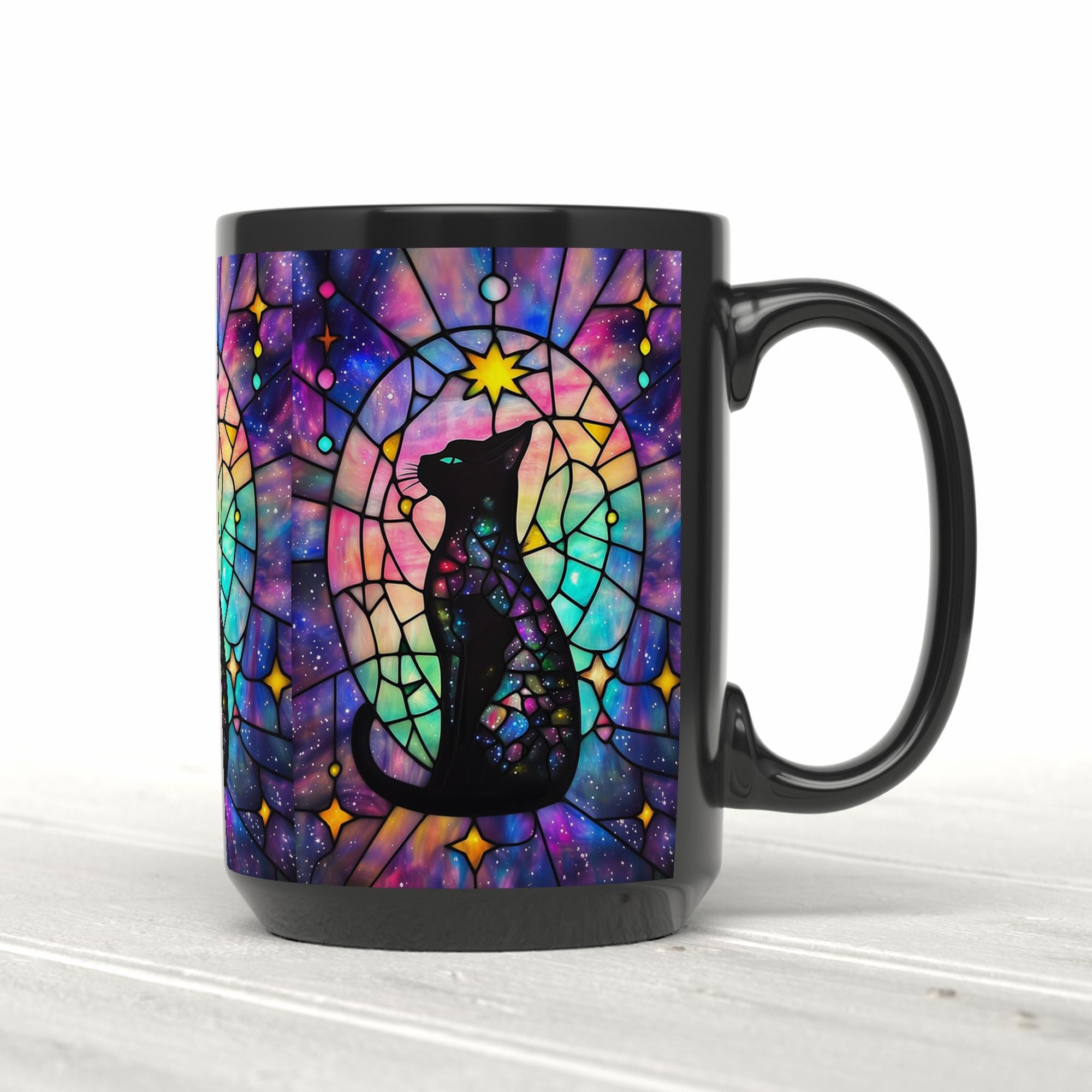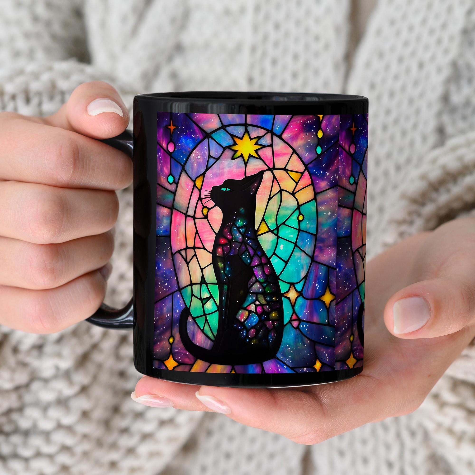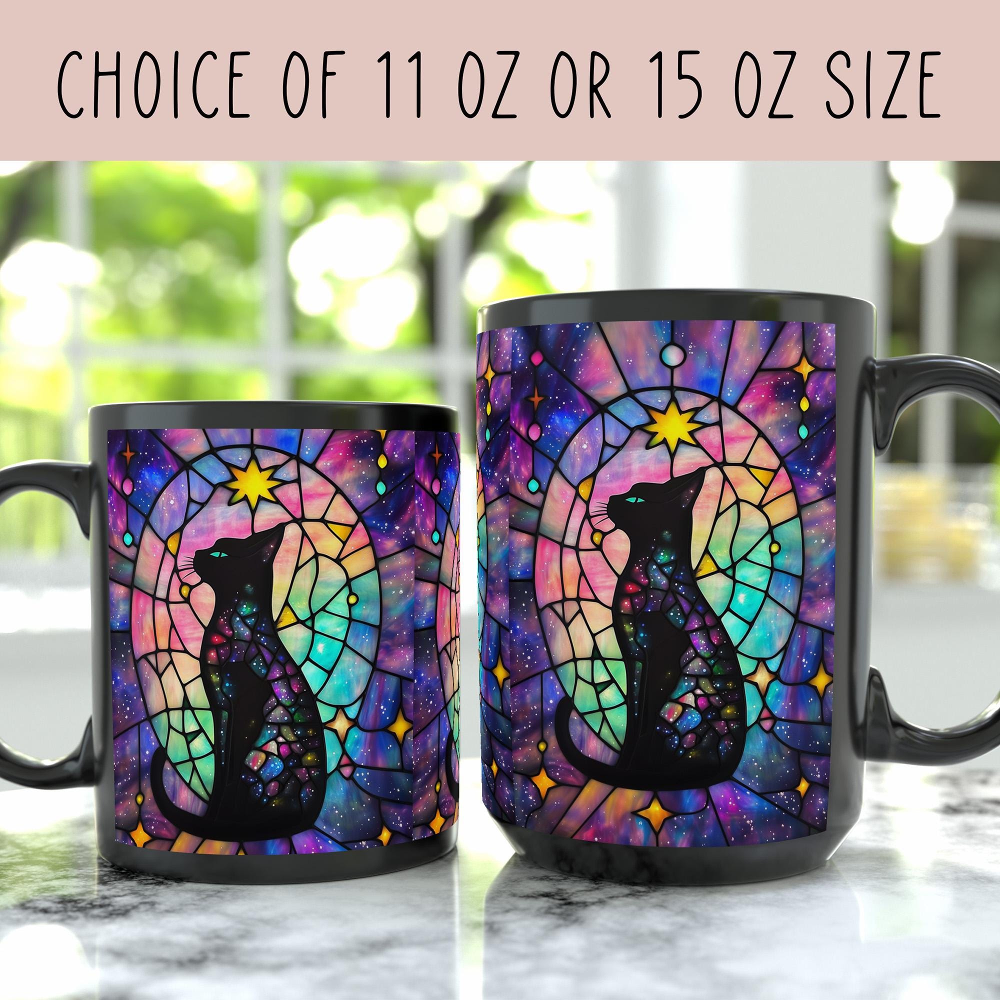 Celestial Black Cat Coffee Mug, Stained Glass Look