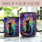 Celestial Black Cat Coffee Mug with a vibrant stained glass look. Perfect for Halloween or mystical mornings. A unique gift for cat lovers. Available in 11 oz or 15 oz. Design is printed on both sides. Microwave and dishwasher safe. C-shaped handles. Ceramic with a glossy finish. The mug’s interior color matches the handle color.