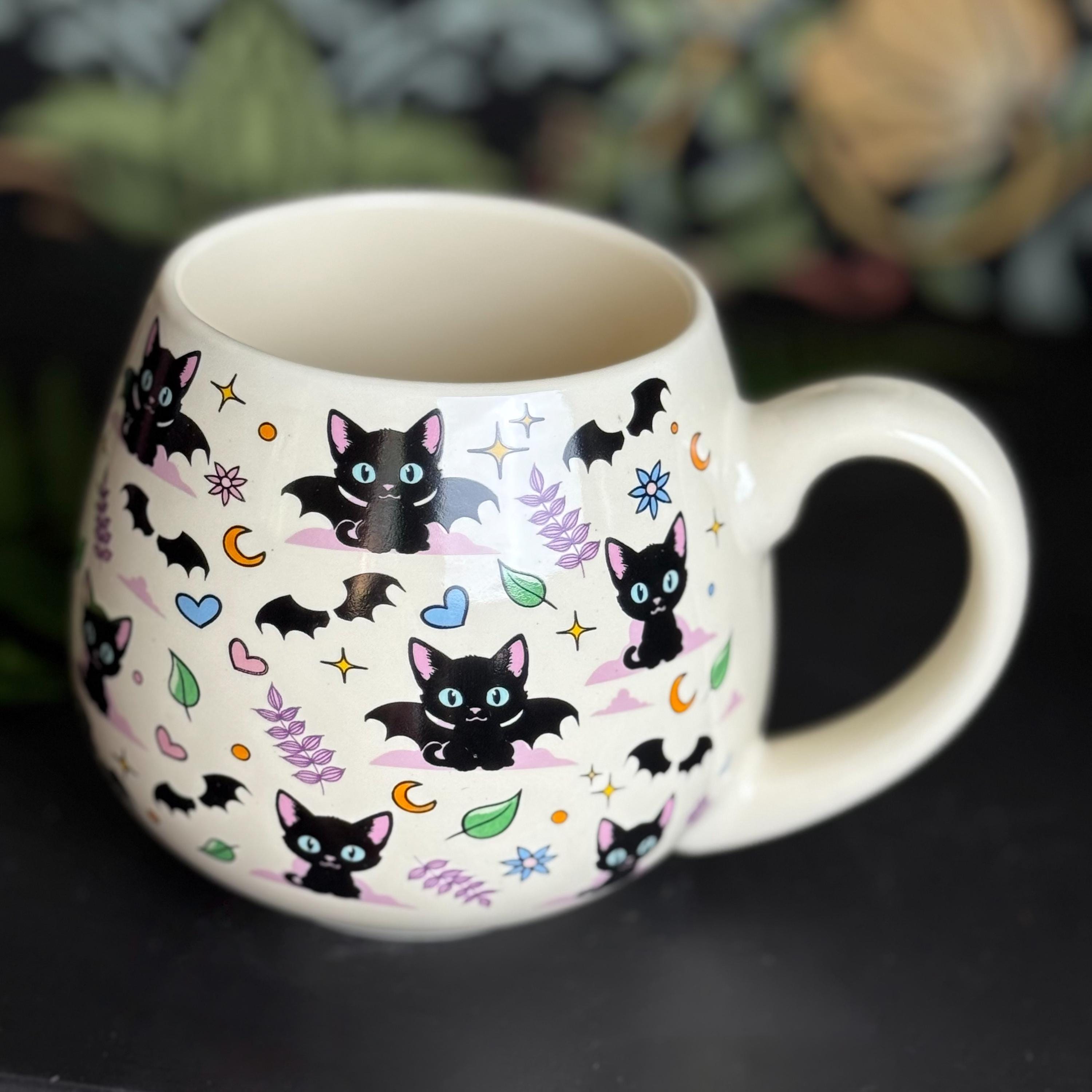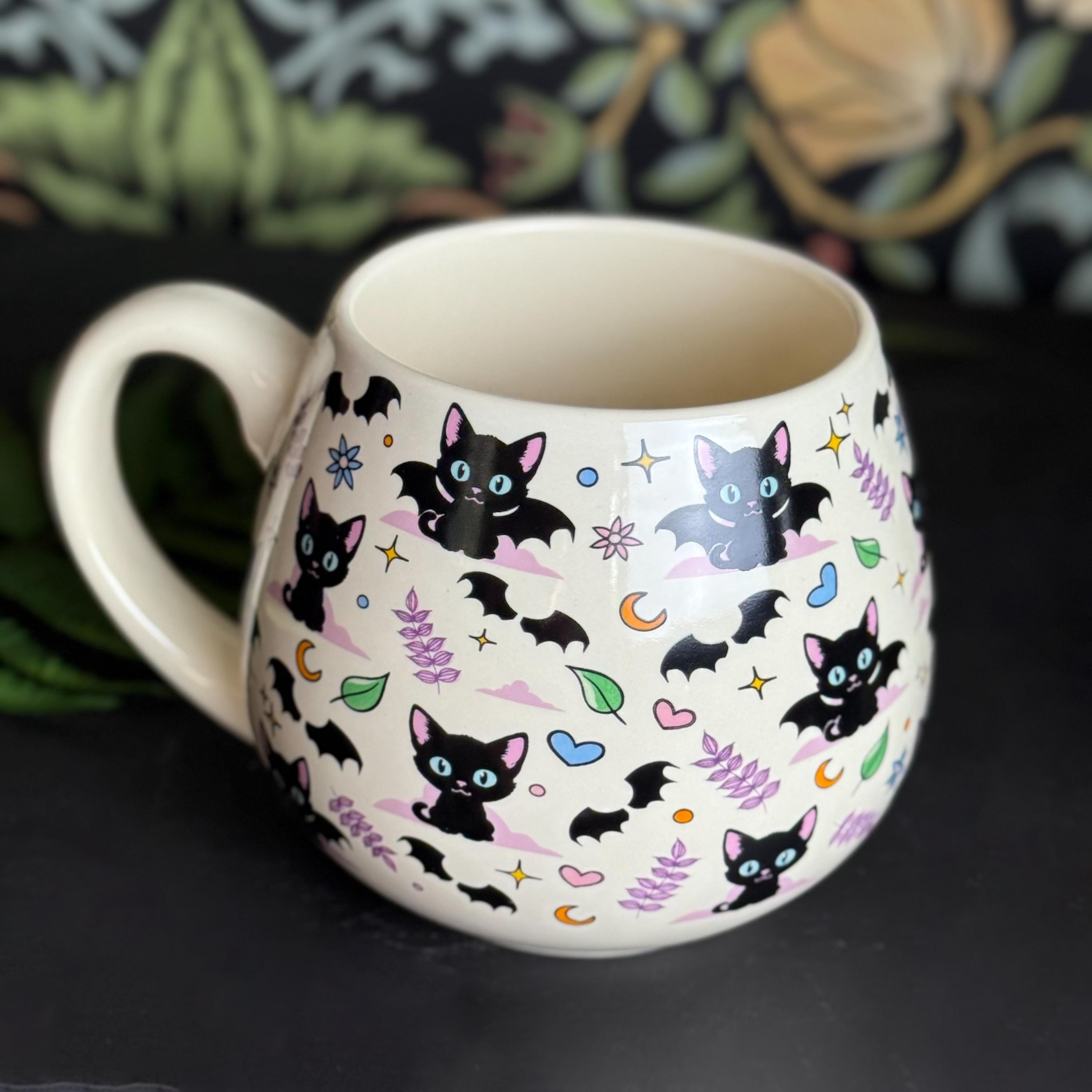 Sip your favorite brew in bewitching style with this rounded ceramic mug, featuring an all-over print of black cats, crescent moons, and stars. Perfect for cat lovers and anyone who enjoys a magical touch in their kitchen.