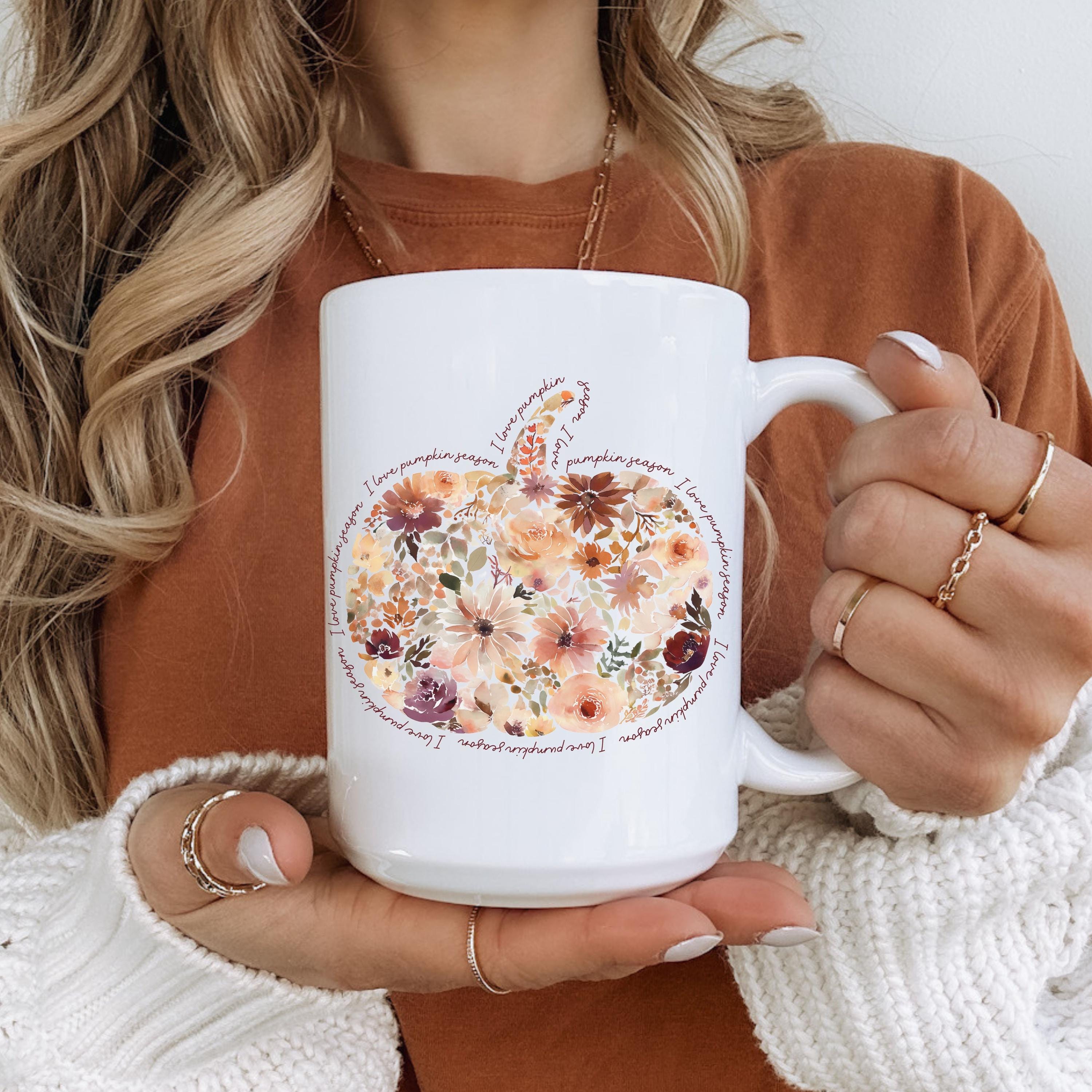 Boho floral pumpkin mug with “I love pumpkin season” design. Available in 11 oz or 15 oz. Design is printed on both sides. Microwave and dishwasher safe. C-shaped handles. Ceramic with a glossy finish. Interior color matches handle color. Hand wash or dishwasher safe.