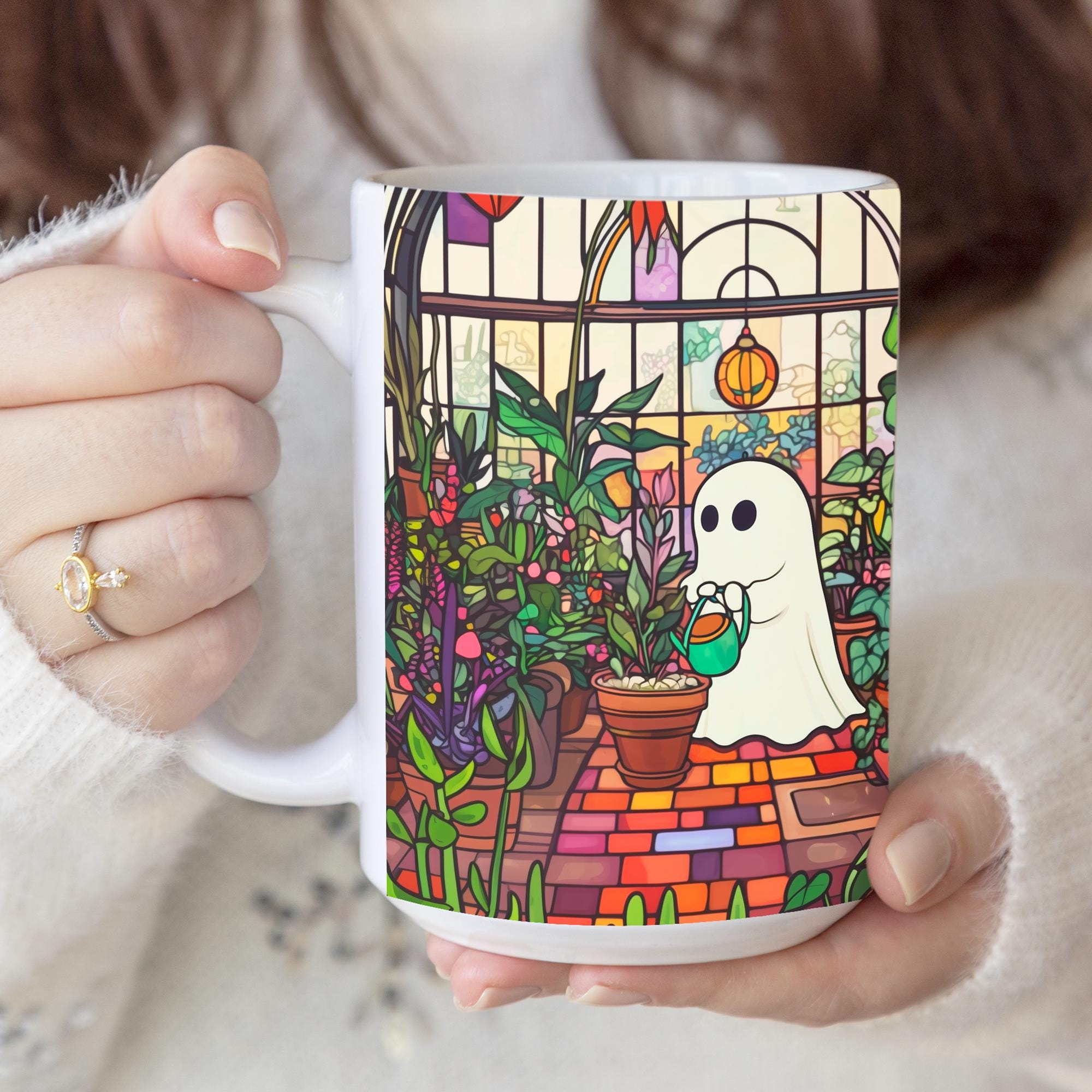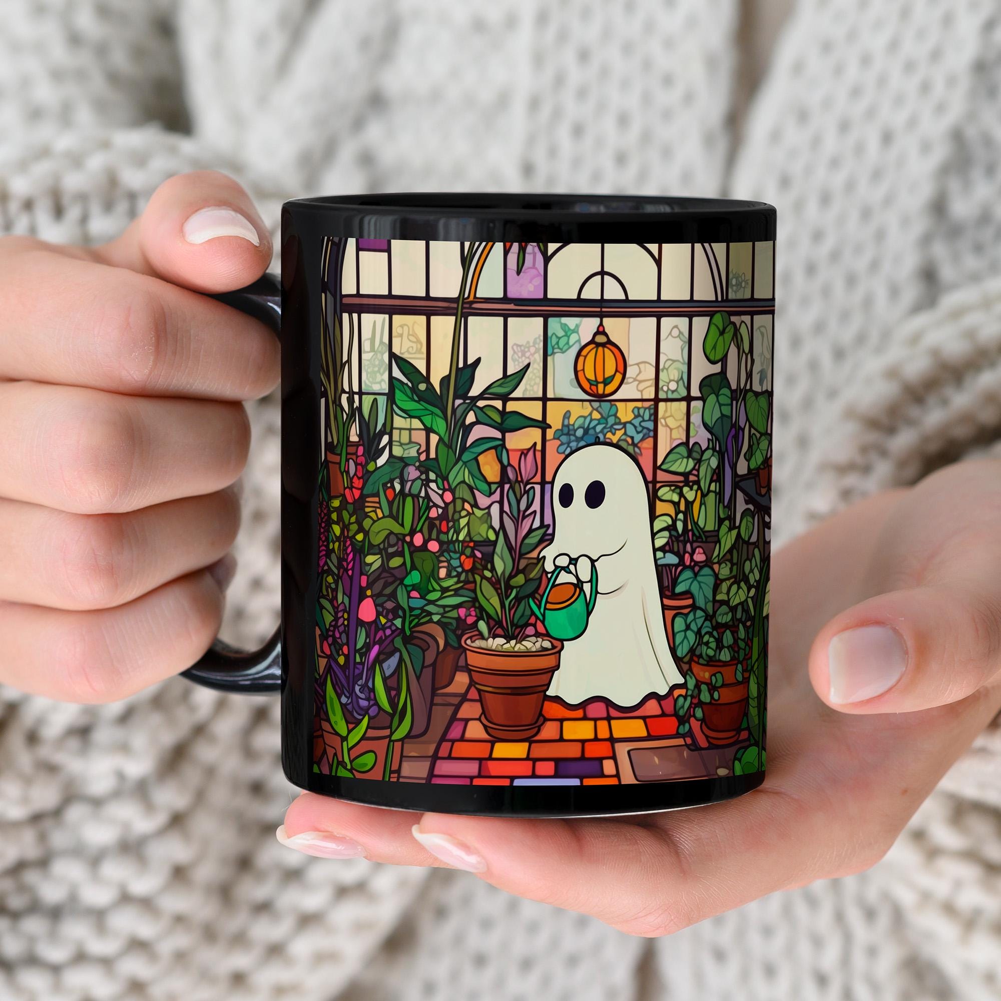 Add a spooky twist to your morning routine with this adorable ghost tending plants inside a vibrant stained glass greenhouse — perfect for plant lovers and Halloween fans.