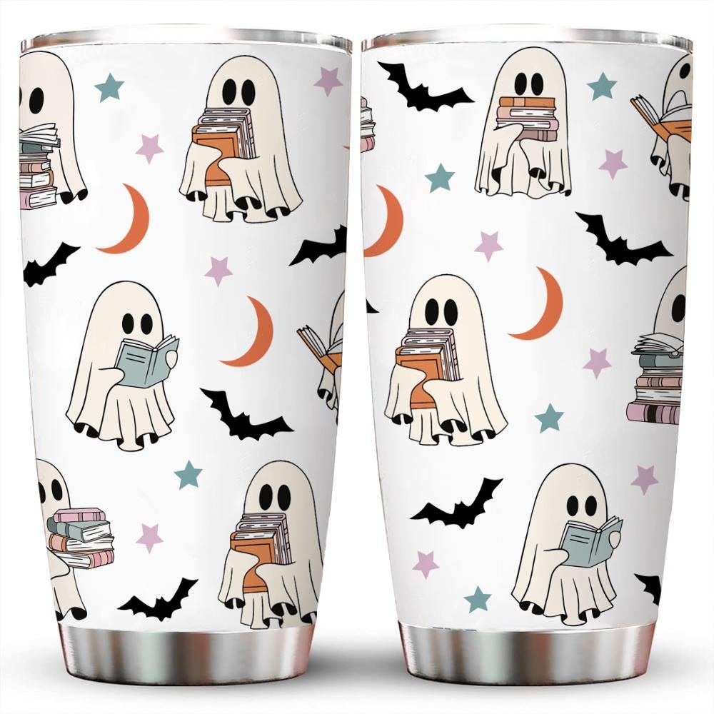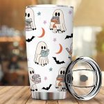This 20-ounce tumbler features a cute ghost reading design, perfect for book lovers and Halloween enthusiasts. It’s ideal for travel and keeps drinks cold for several hours. The design is vibrant and durable. Available in various styles, including skinny, fat, slim bottle, and 12-ounce wine tumbler options. The lid is removable for easy cleaning. It makes a great gift.