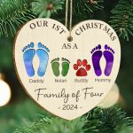 Create lasting memories with the First Christmas As A Family Of Four Color Footprints – Personalized Custom Shaped Wooden Ornament. This unique ornament makes a delightful gift for family members, including parents, siblings, and pet lovers, on Mother’s Day, Father’s Day, Thanksgiving, Christmas, birthdays, and anniversaries.