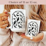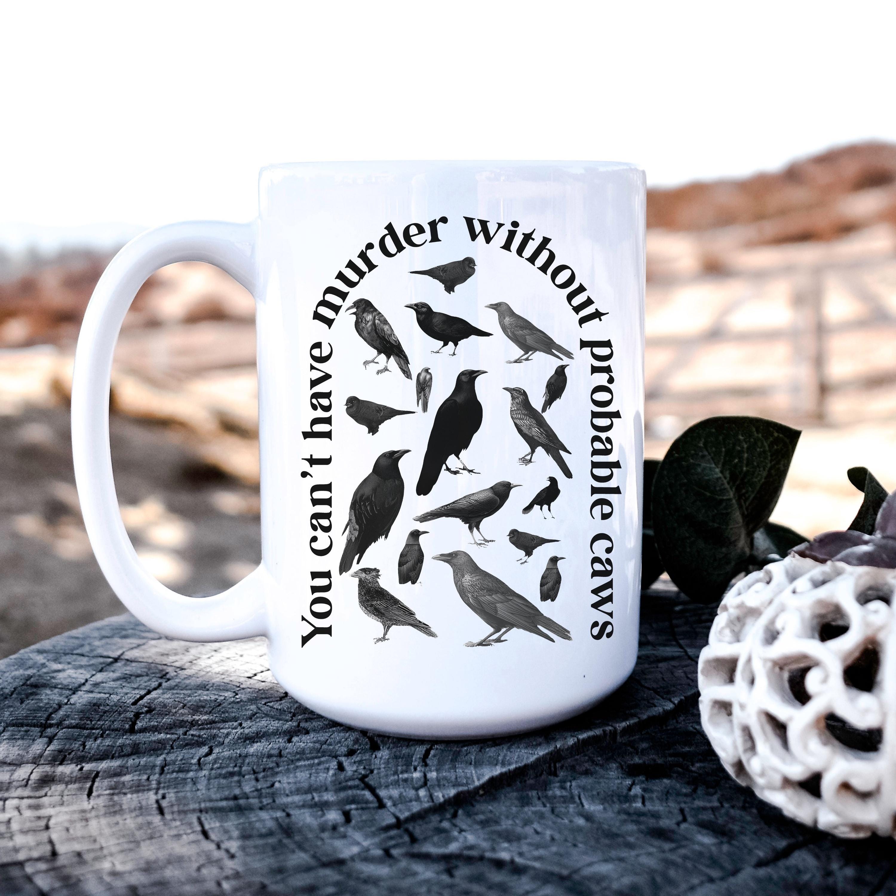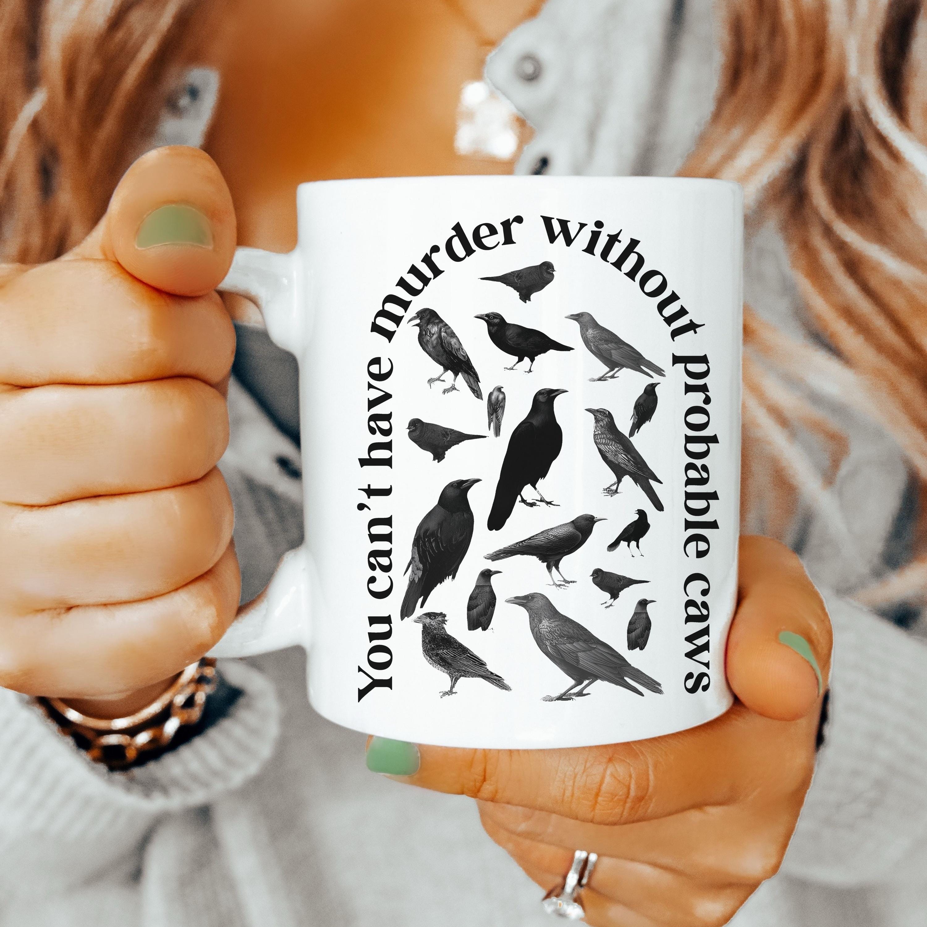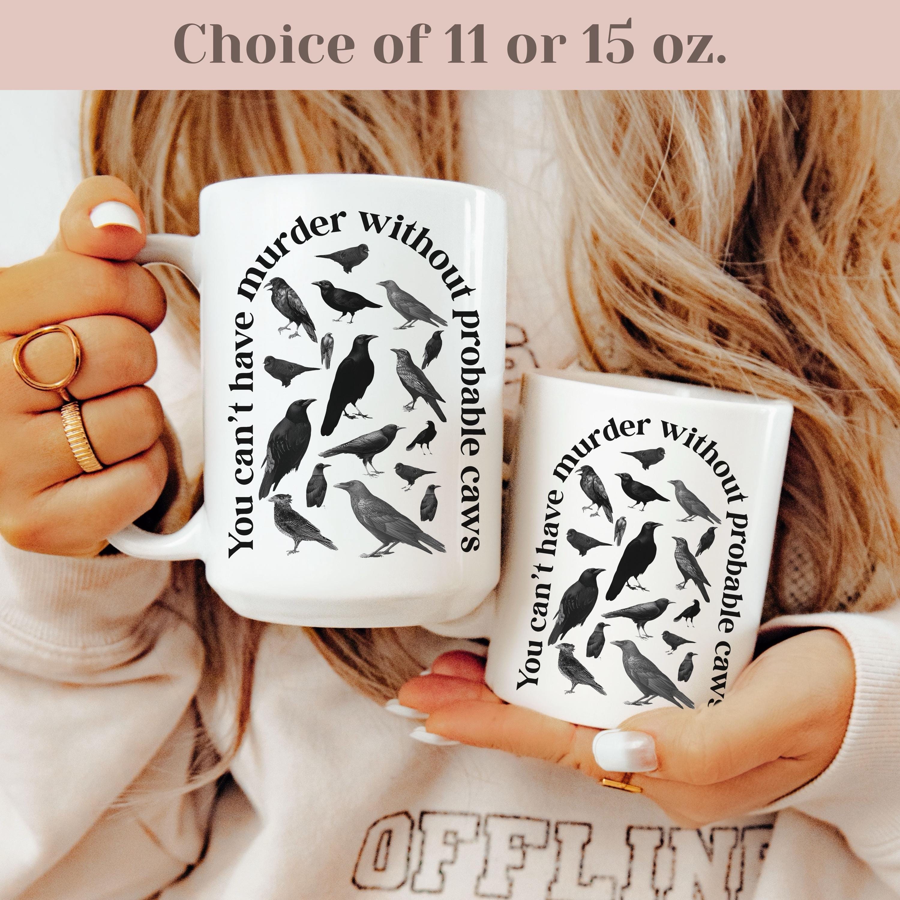 A crow-themed mug featuring the pun “you can’t have murder without probable caws.” Perfect for true crime fans and gothic gift-givers. Available in 11 oz or 15 oz. Design is printed on both sides. Microwave and dishwasher safe. C-shaped handles. Ceramic with a glossy finish.