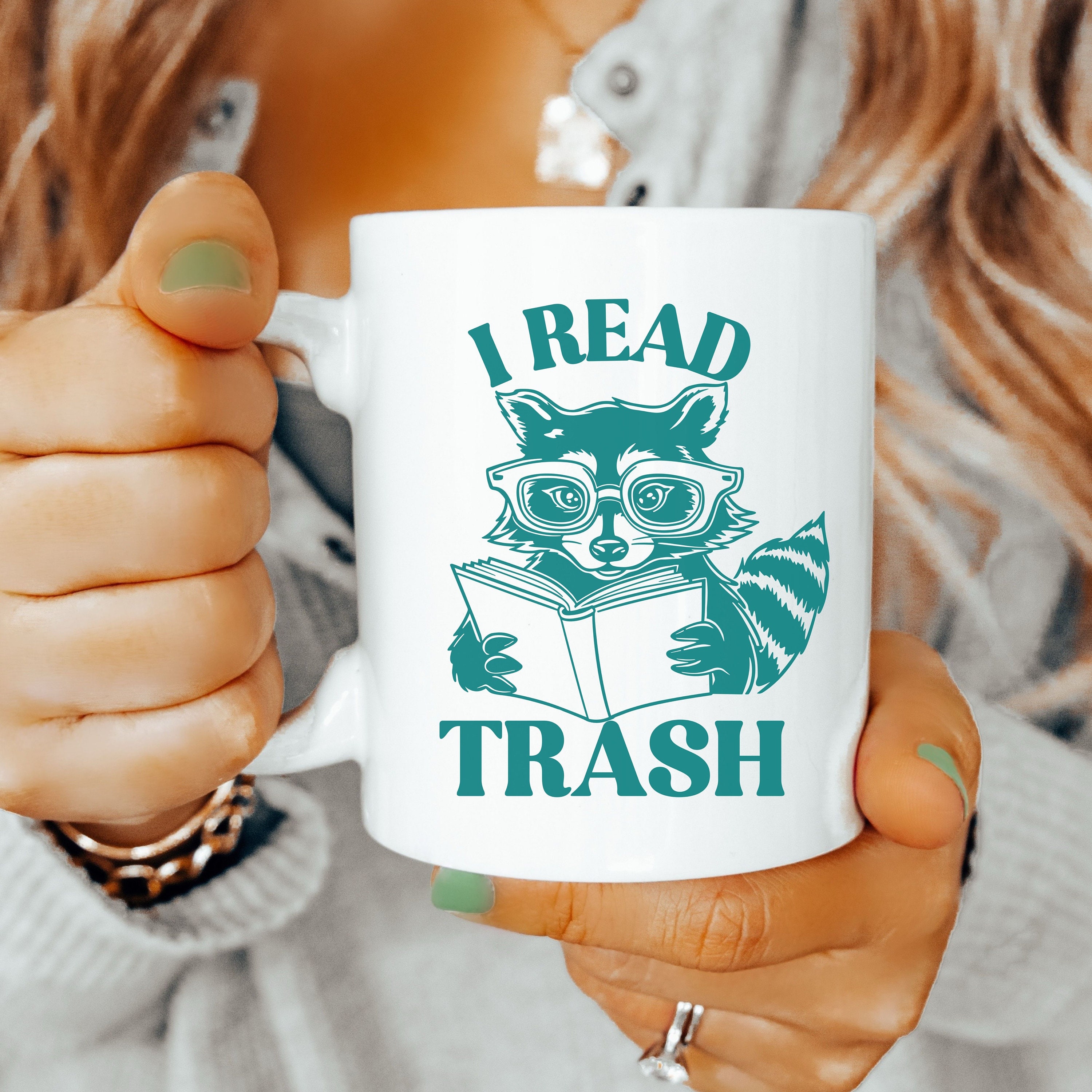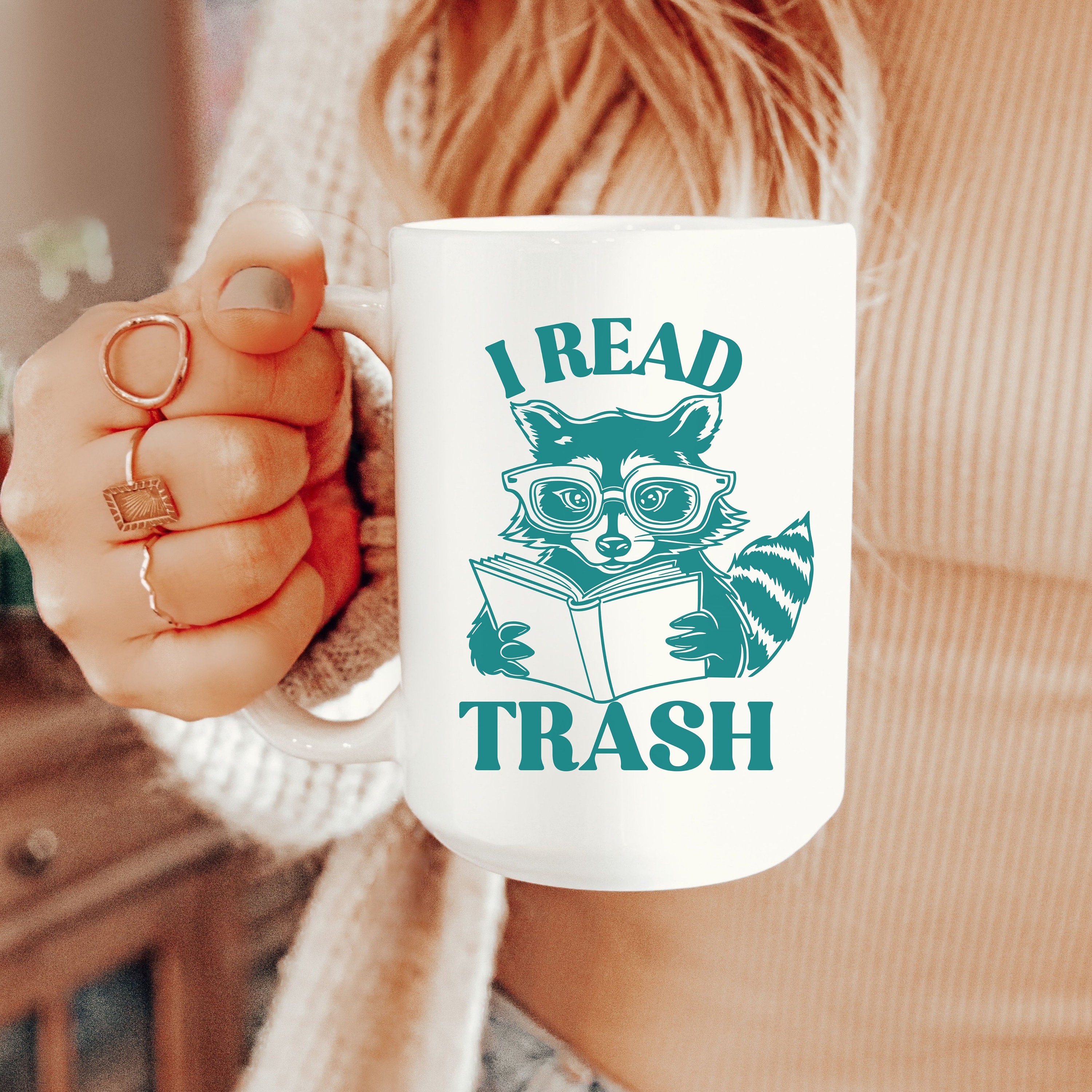 Start your day with a laugh and a cup of coffee in this funny raccoon reading coffee mug. Perfect for book enthusiasts and booktroverts, this quirky coffee cup makes a delightful gift for fans of smut and romantasy genres. Celebrate your love for reading with this charming and humorous bookish gift, ideal for bookworms and book lovers. A playful addition to your mug collection or a thoughtful present for a fellow reader. Available in 11 oz or 15 oz. Design is printed on both sides. Microwave and dishwasher safe. C-shaped handles. The mug is made from ceramic with a glossy finish.