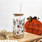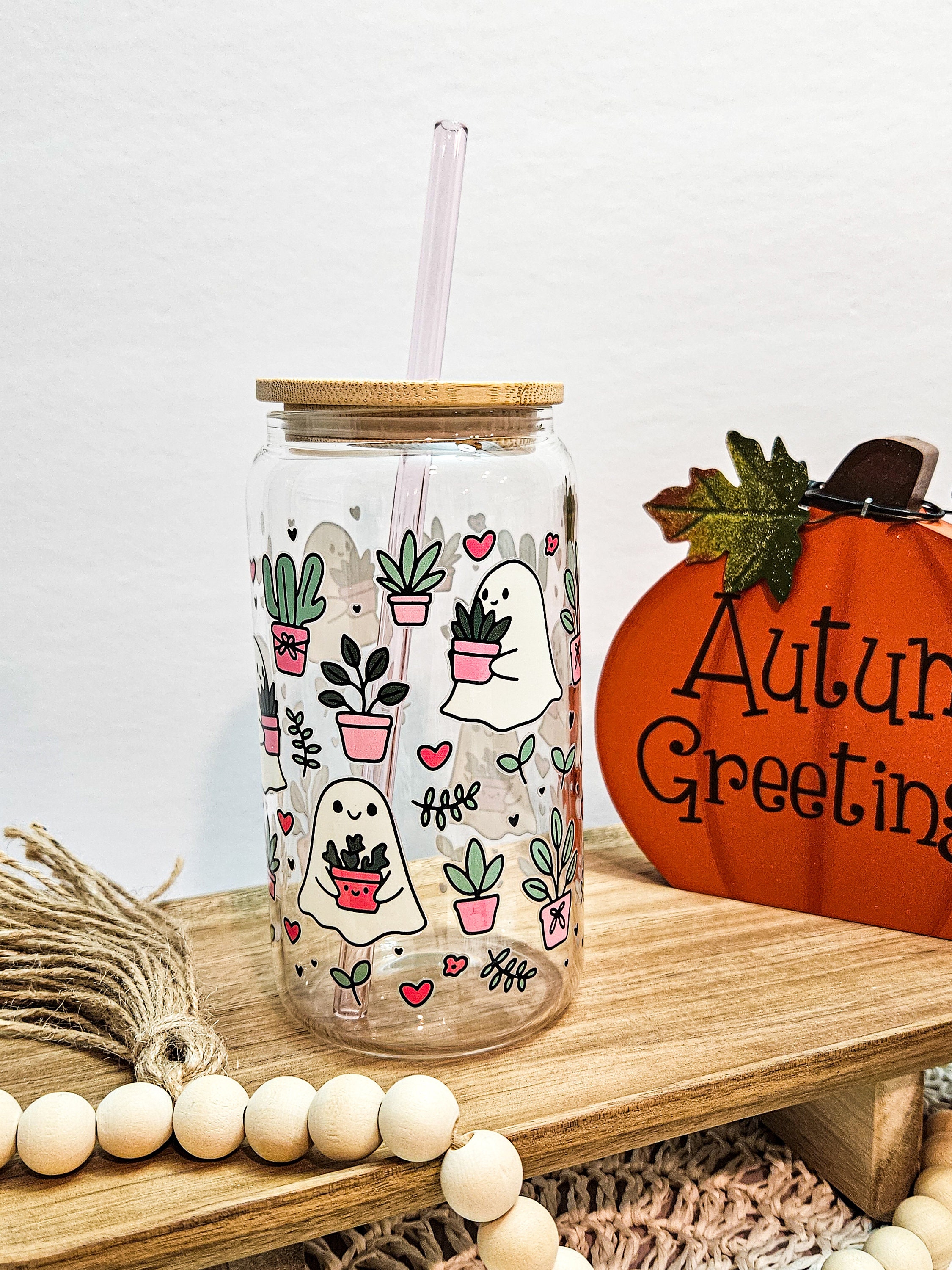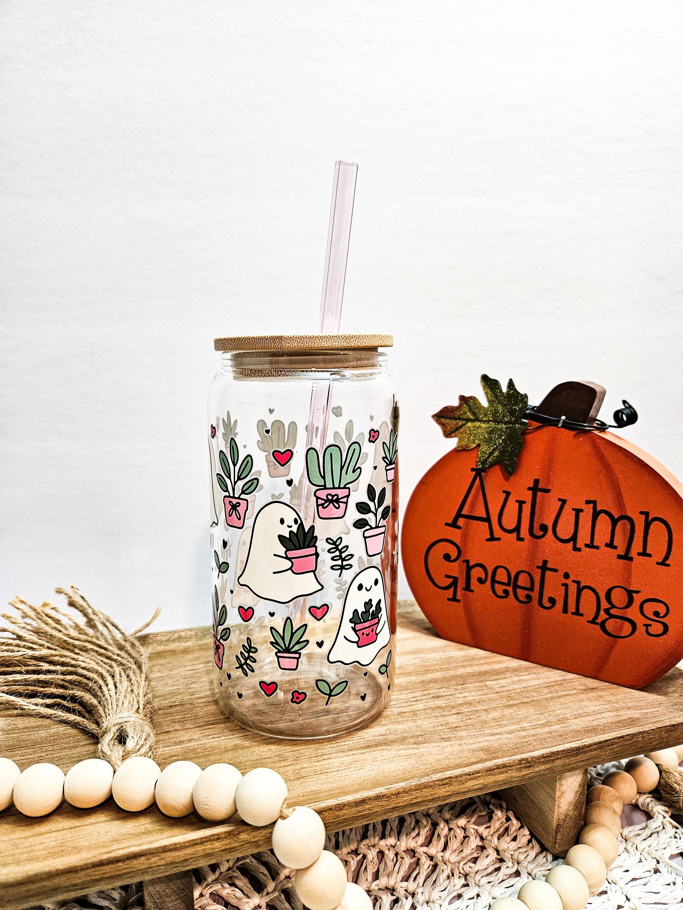 This cute ghost plant glass cup with pink flower pots is the perfect match for any Halloween-loving plant mom! Featuring a ghost surrounded by a variety of potted plants, it brings a playful and spooky touch to your fall drinkware.