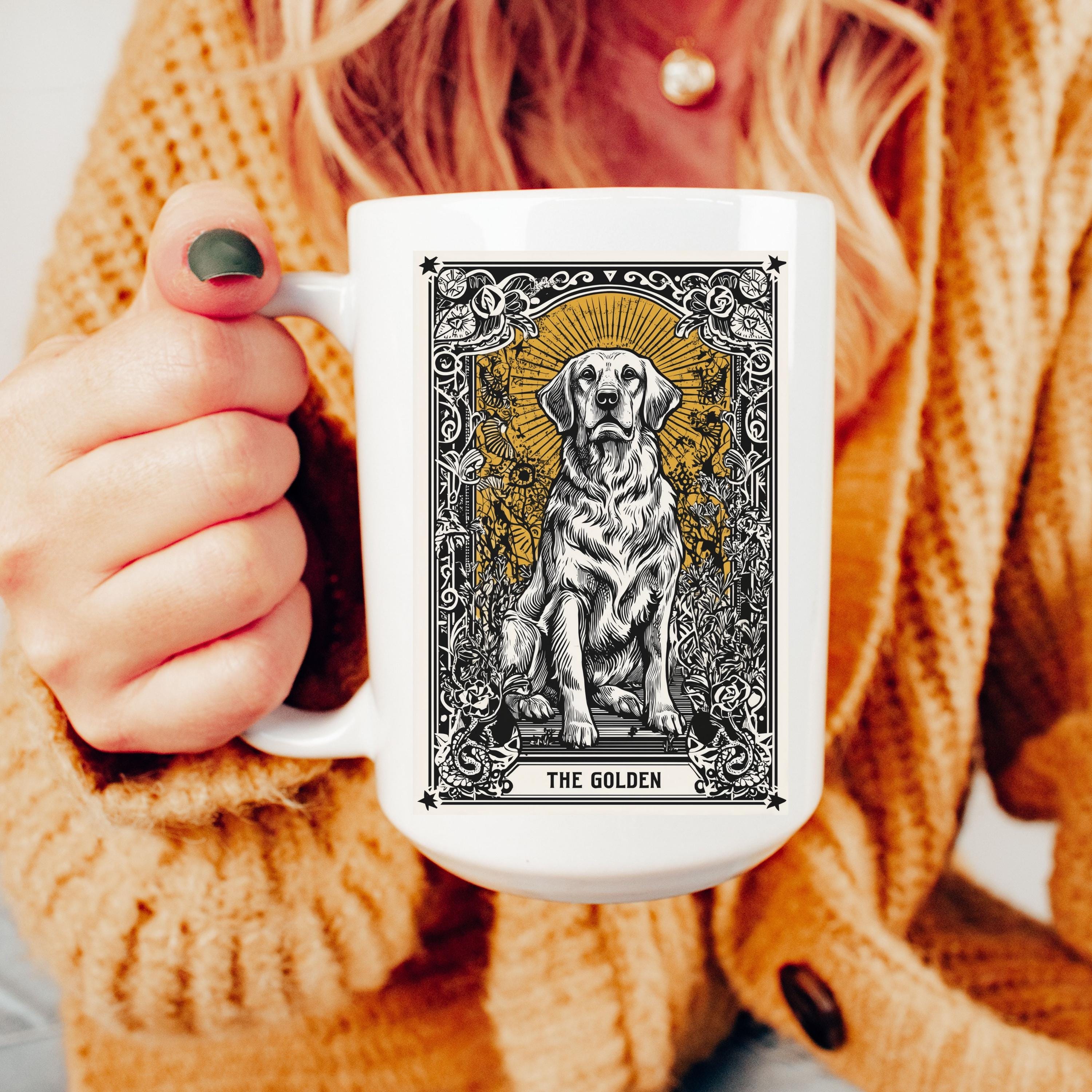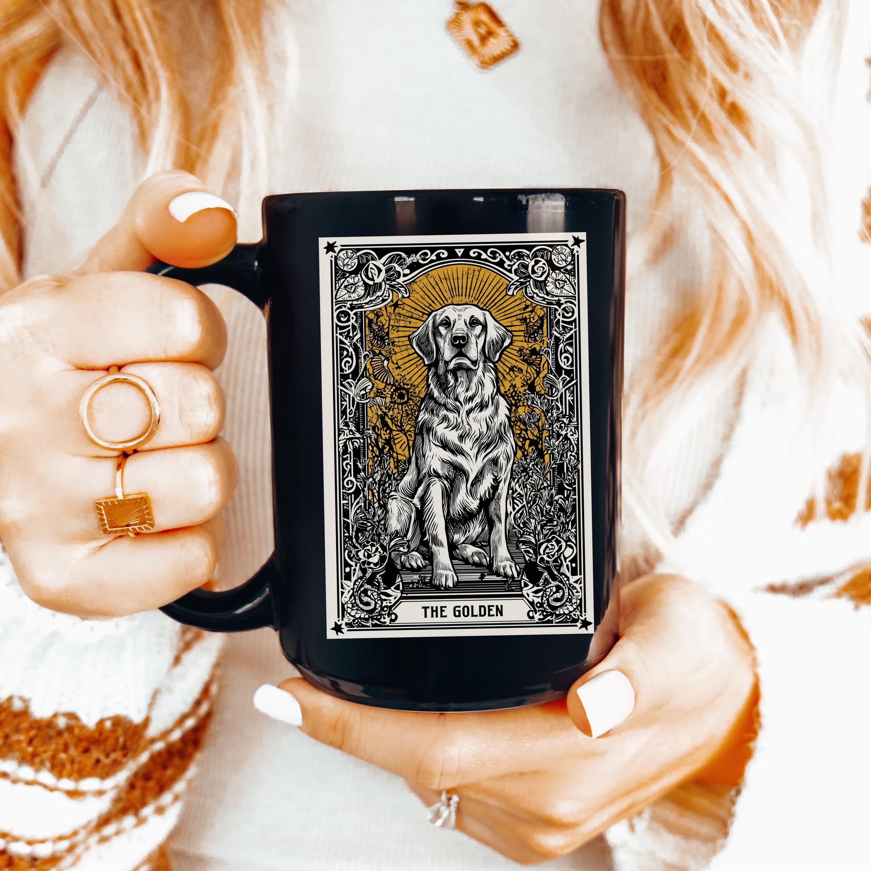 Celebrate your love for Golden Retrievers with this beautifully detailed gothic tarot-style ceramic mug. A perfect gift for dog moms, pet lovers, or anyone enchanted by their furry best friend.