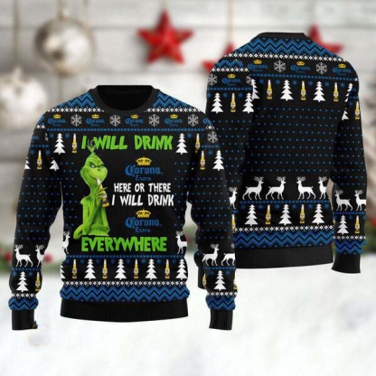 Grinch I Will Drink Crisp And Refreshing Lager Extra Everywhere Ugly Christmas Sweater