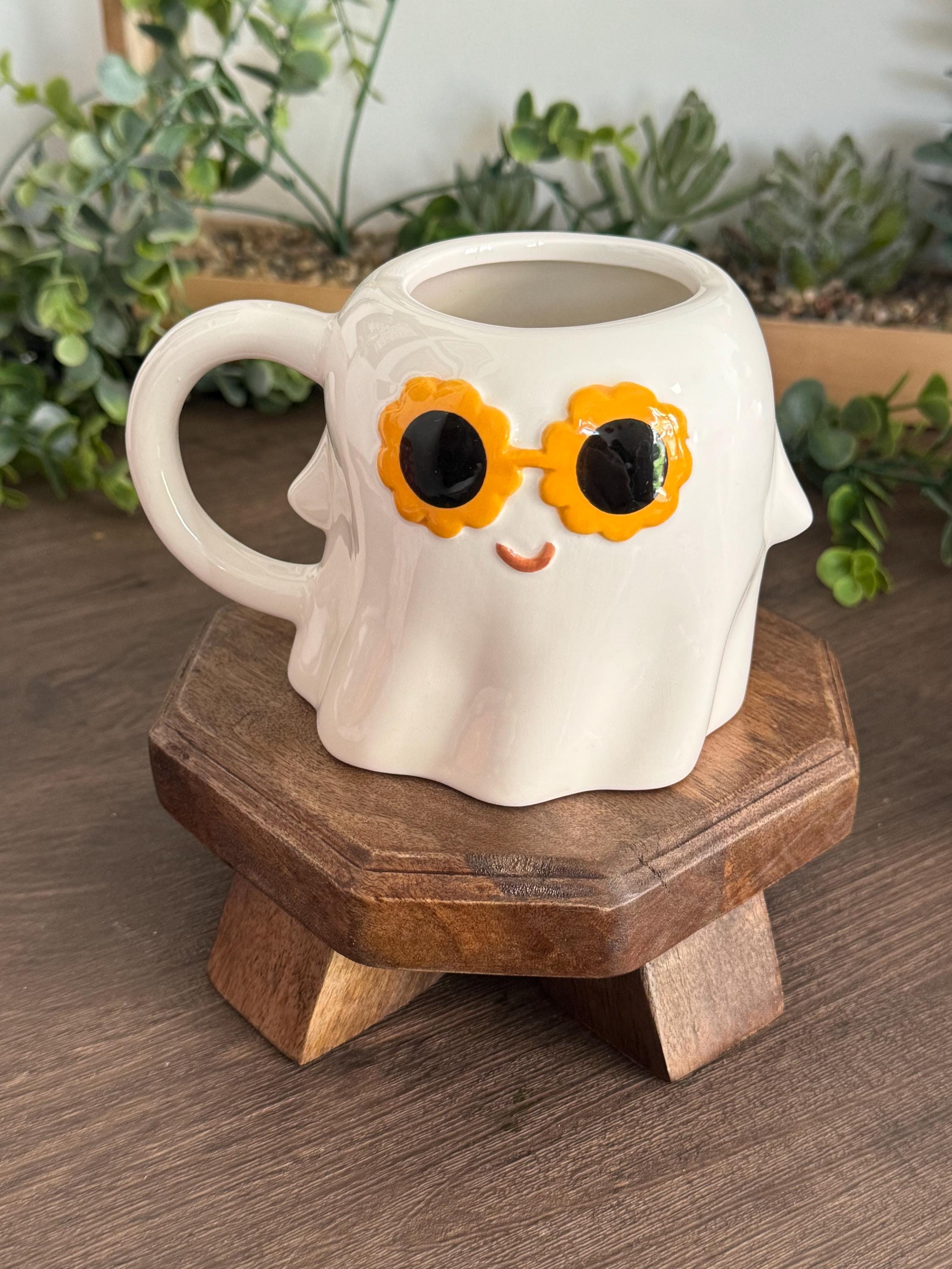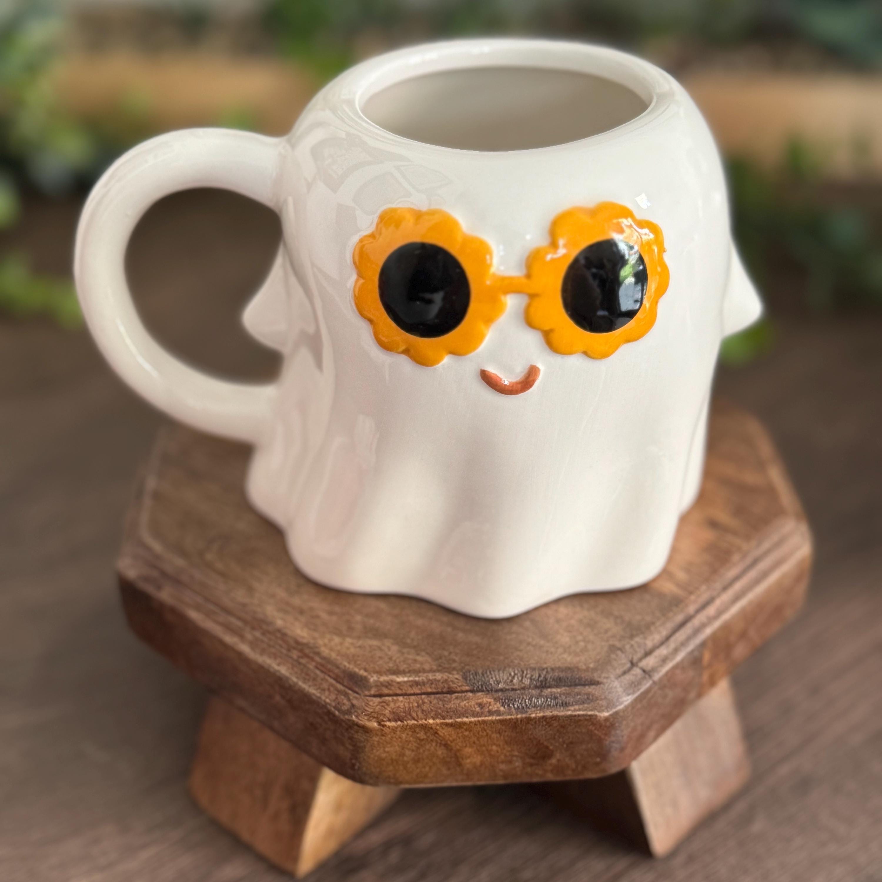 Sip your favorite brew in style with this playful ghost-shaped ceramic mug, featuring a groovy ghost sporting retro 60s-style sunglasses. A fun and quirky addition to your Halloween drinkware or year-round mug collection.