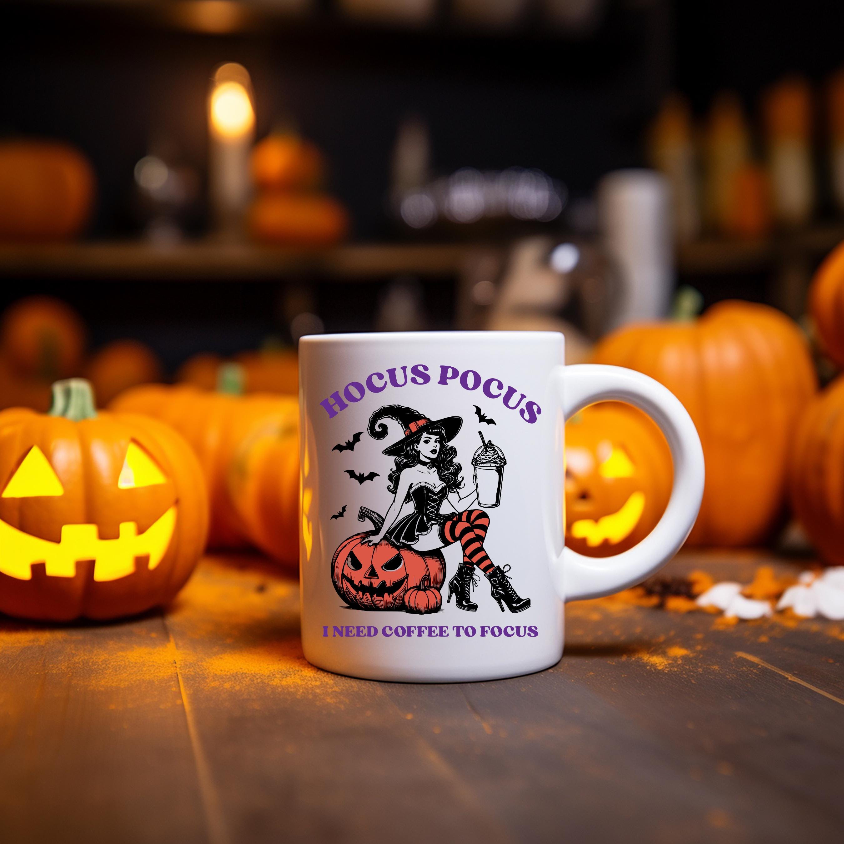 Start your spooky season in style with this playful Halloween mug featuring a vintage pin-up witch perched on a pumpkin, surrounded by bats and coffee magic. Designed for witchy souls who run on caffeine and chaos, it’s perfect for adding charm to your morning ritual.