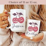 Personalized jack-o’-lantern cherries mug features cute cherry pumpkins with carved faces and your name. Perfect for cottagecore Halloween lovers. Available in 11 oz or 15 oz. Design printed on both sides. Microwave and dishwasher safe. C-shaped handles. Ceramic with a glossy finish. Hand wash or dishwasher safe.