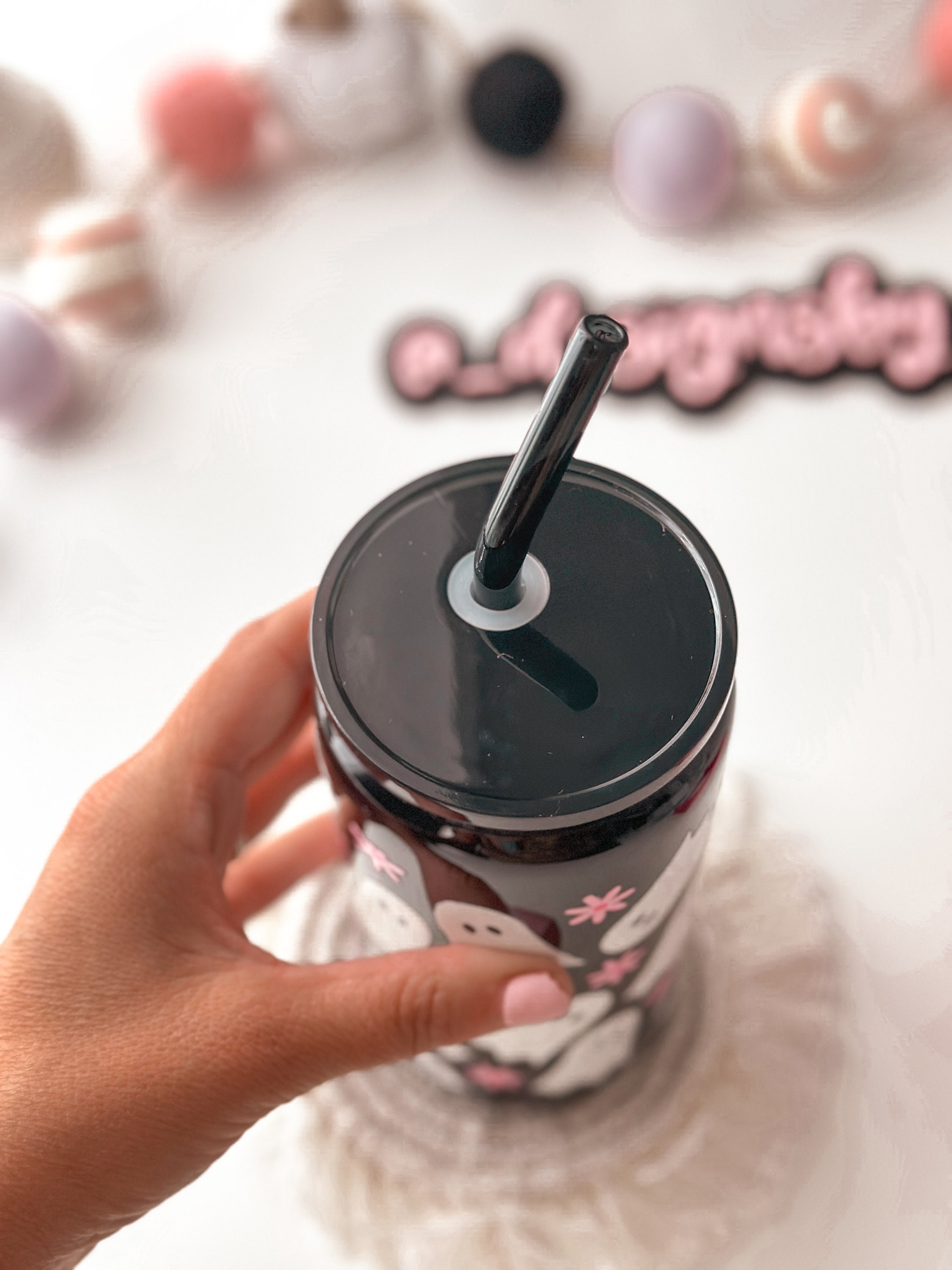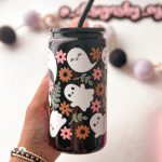 This 16-ounce black glass tumbler features a charming Halloween design of ghosts and daisies. It includes a snug-fitting black acrylic lid to prevent spills and a reusable black glass straw. Perfect for iced coffee or other cold beverages, it’s both stylish and environmentally friendly, making it an ideal Halloween gift.