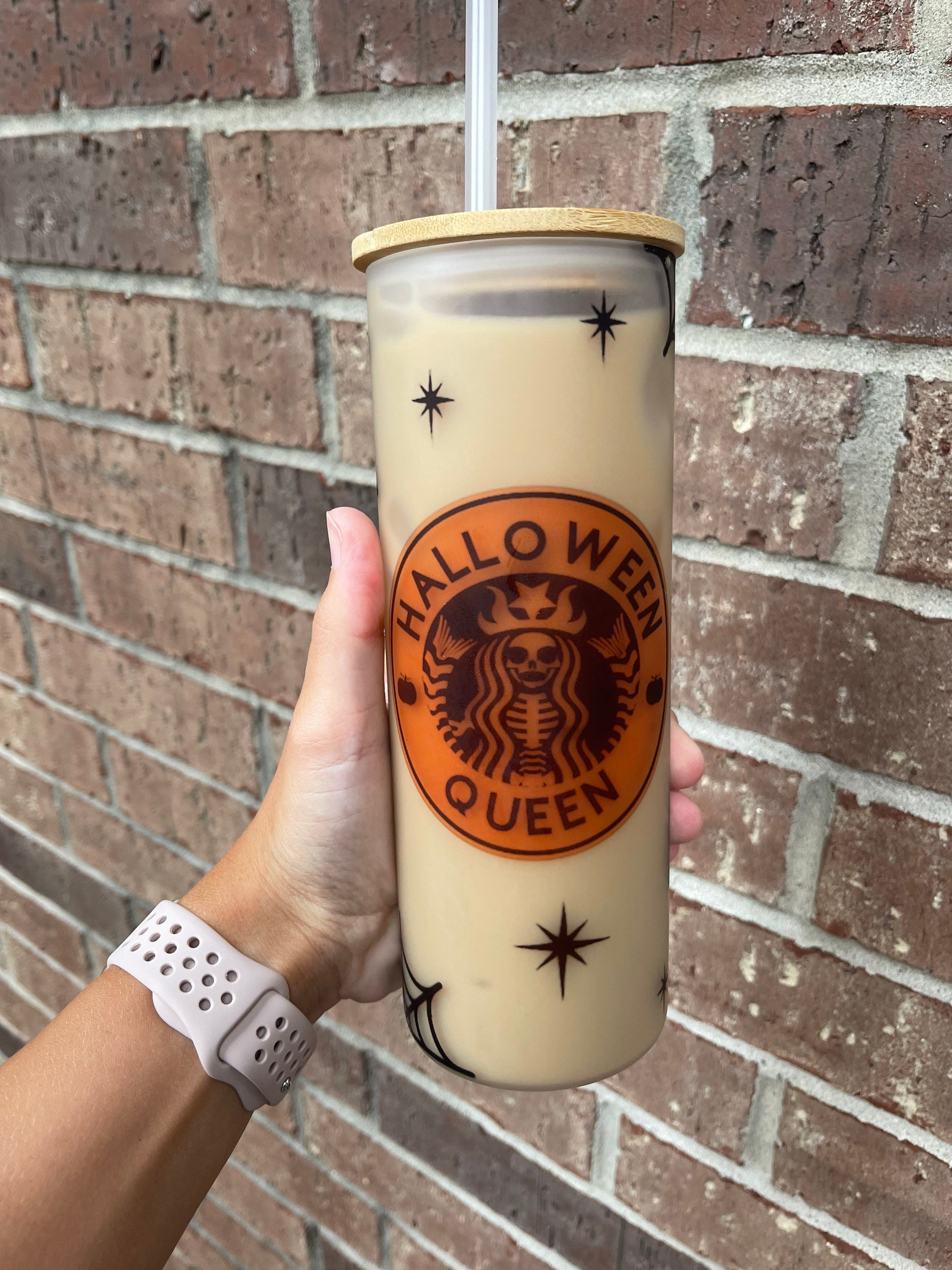A Halloween Queen-themed cup, complete with a lid and straw, perfect for enjoying your favorite beverage during the Halloween season. Hand wash only.