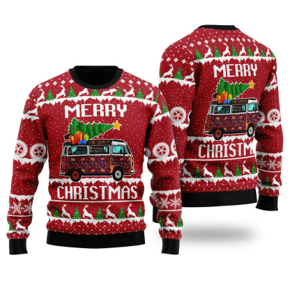 Hippie Car Merry Christmas Red Ugly Christmas Sweater