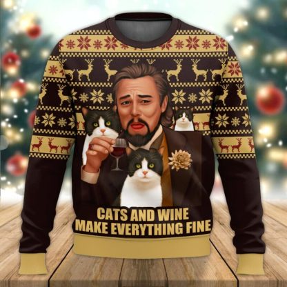 Leonardo Dicaprio Cats And Wine Make Everything Fine Ugly Christmas Sweater Gift