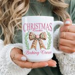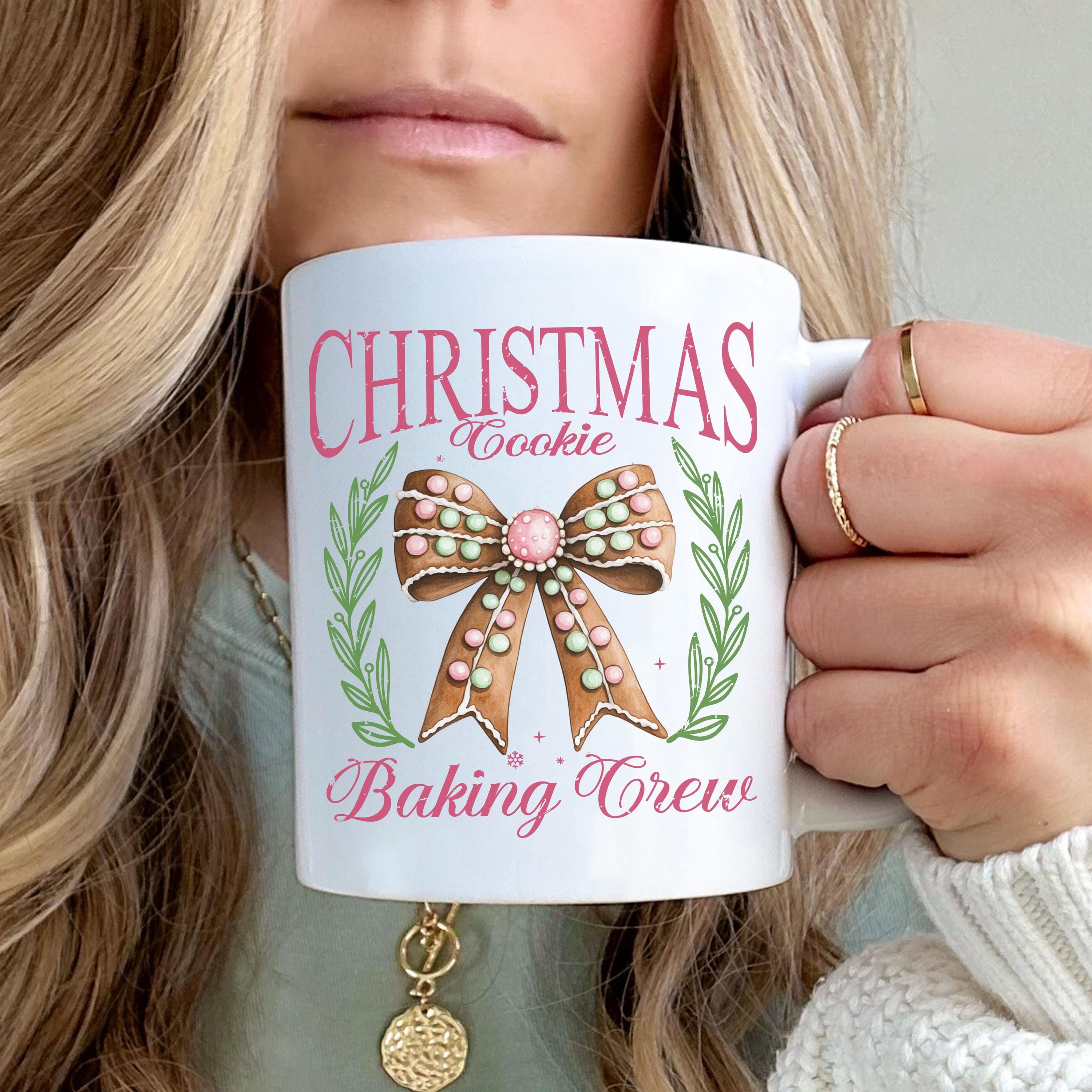 Adorable pink Christmas coffee mug with gingerbread bow. Perfect gift for friend or mom. Cozy Christmas vibes. Available in 11 oz or 15 oz sizes. Design printed on both sides, microwave and dishwasher safe, C-shaped handle. Ceramic with glossy finish.
