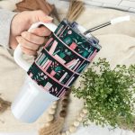 This 40 oz tumbler features a whimsical bookshelf design with pink books, florals, and potted plants. A sweet gift for book lovers. The design does not wrap fully under the handle; there will be a small white gap. It’s dishwasher safe, made of food-grade stainless steel, double-wall vacuum insulated, and comes individually boxed. Includes a detachable handle, lid with silicone stopper, stainless steel straw, and cleaning brush.