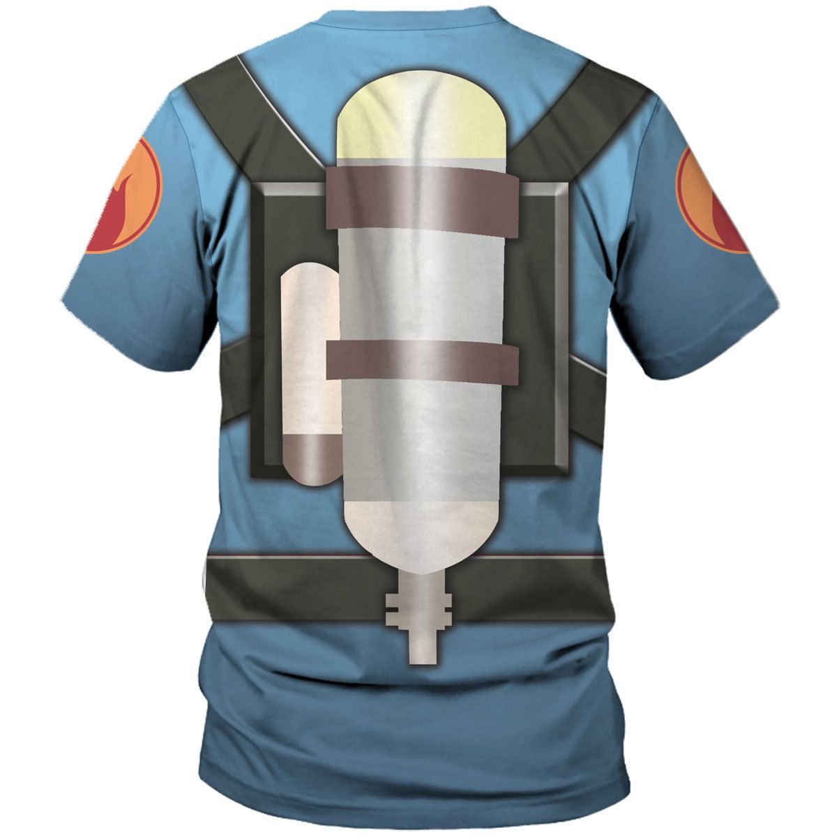 The Pyro Blue Team TF2 t-shirt from The Halloween Smoke is a fantastic choice for all-over-print apparel lovers, making it a standout gift for fans of the game and unique fashion enthusiasts alike. Personalize your style with this one-of-a-kind piece that captures the essence of your favorite character in vibrant detail.