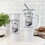 This Halloween tumbler features an adorable ghost reading. Available in 20 or 40 oz sizes, it’s perfect for horror book lovers. A cute gift for Halloween. It’s dishwasher safe, made of food-grade stainless steel, double-walled and vacuum insulated. The 40 oz version includes a detachable handle, lid, straw, and cleaning brush. The 20 oz version has a sliding lid and straw. The 20 oz tumbler is 8.25″ tall (8.7″ with lid) and 2.875″ in diameter.