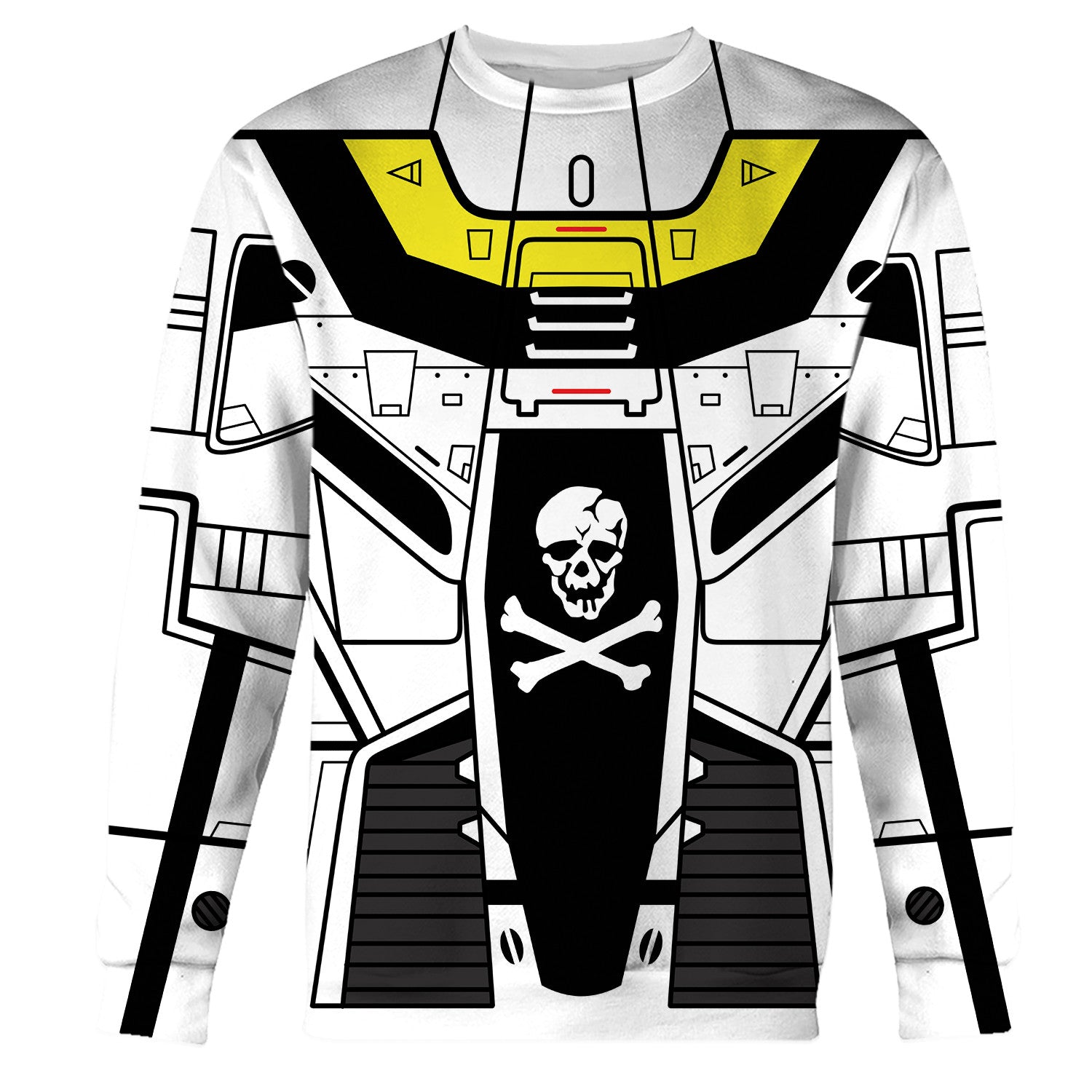 The Robotech Skull One Valkyrie sweatshirt is the perfect choice for all-over-print apparel lovers, offering a striking design that is sure to turn heads. This unique piece from The Halloween Smoke makes for an exceptional gift, and with the option for personalization, it can be a truly one-of-a-kind addition to any wardrobe.