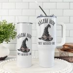 This “Salem 1692 – They Missed One” tumbler features a spooky witch hat and vintage gothic font. It’s perfect for Halloween lovers and those with a rebellious spirit. Available in 20 or 40 oz sizes. The design is printed on both sides, is dishwasher safe, and made of double-wall vacuum-insulated, food-grade stainless steel.