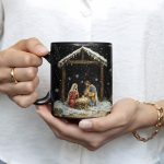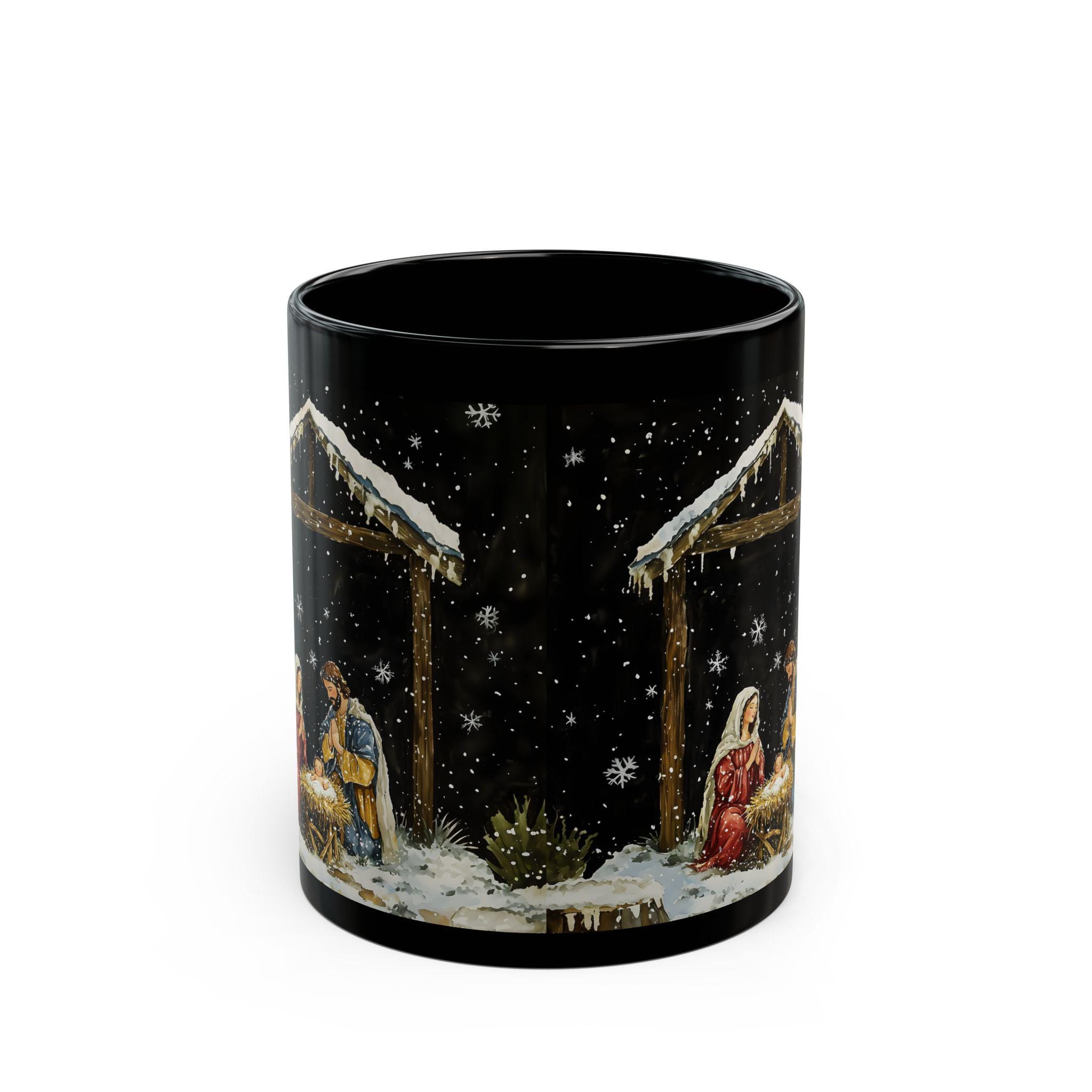 This ceramic mug features a wraparound Nativity design with the Holy Family—Mary, Joseph, and Baby Jesus—set in a peaceful snowy stable scene. A meaningful way to add faith and tradition to your holiday season.