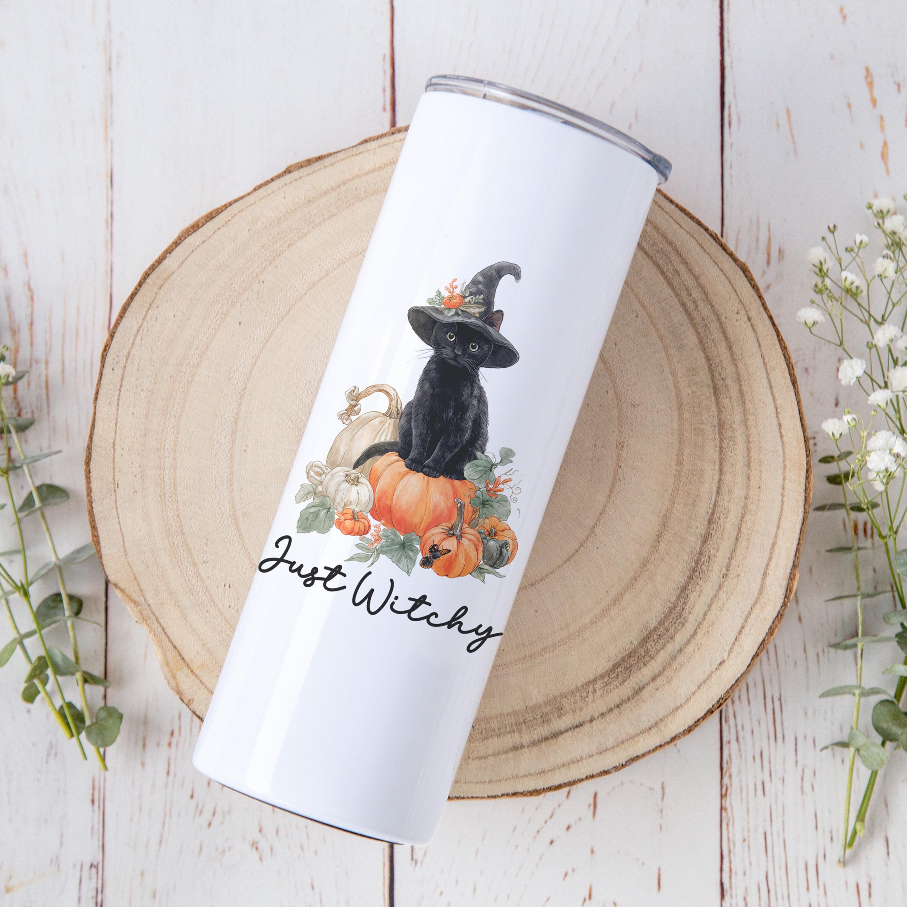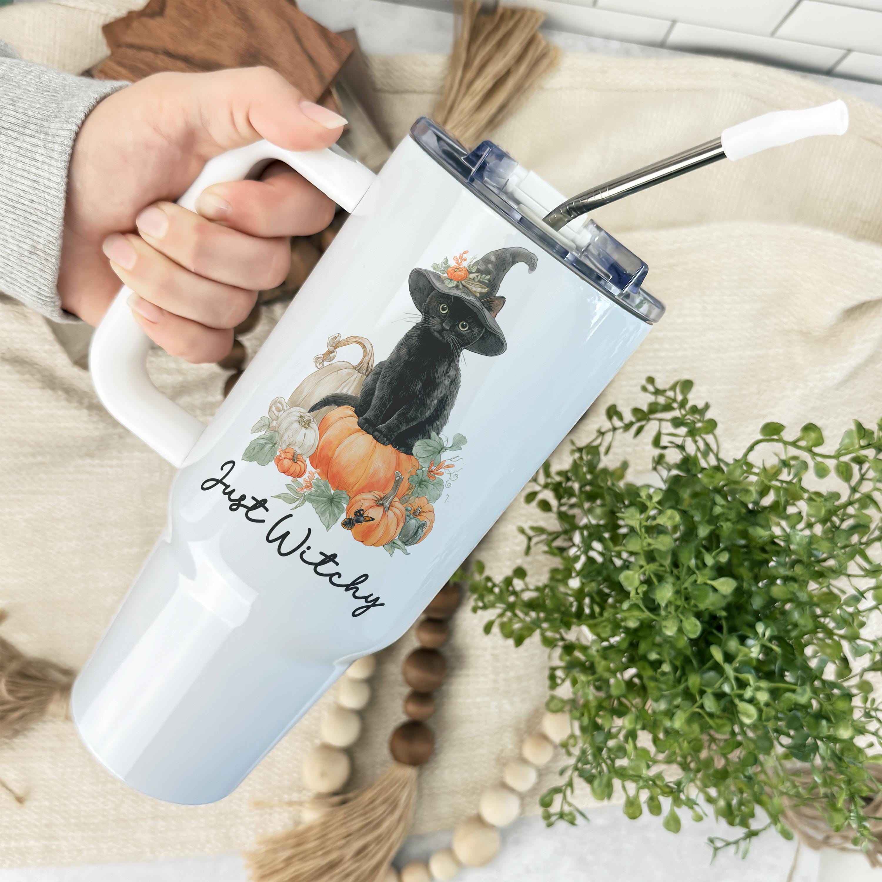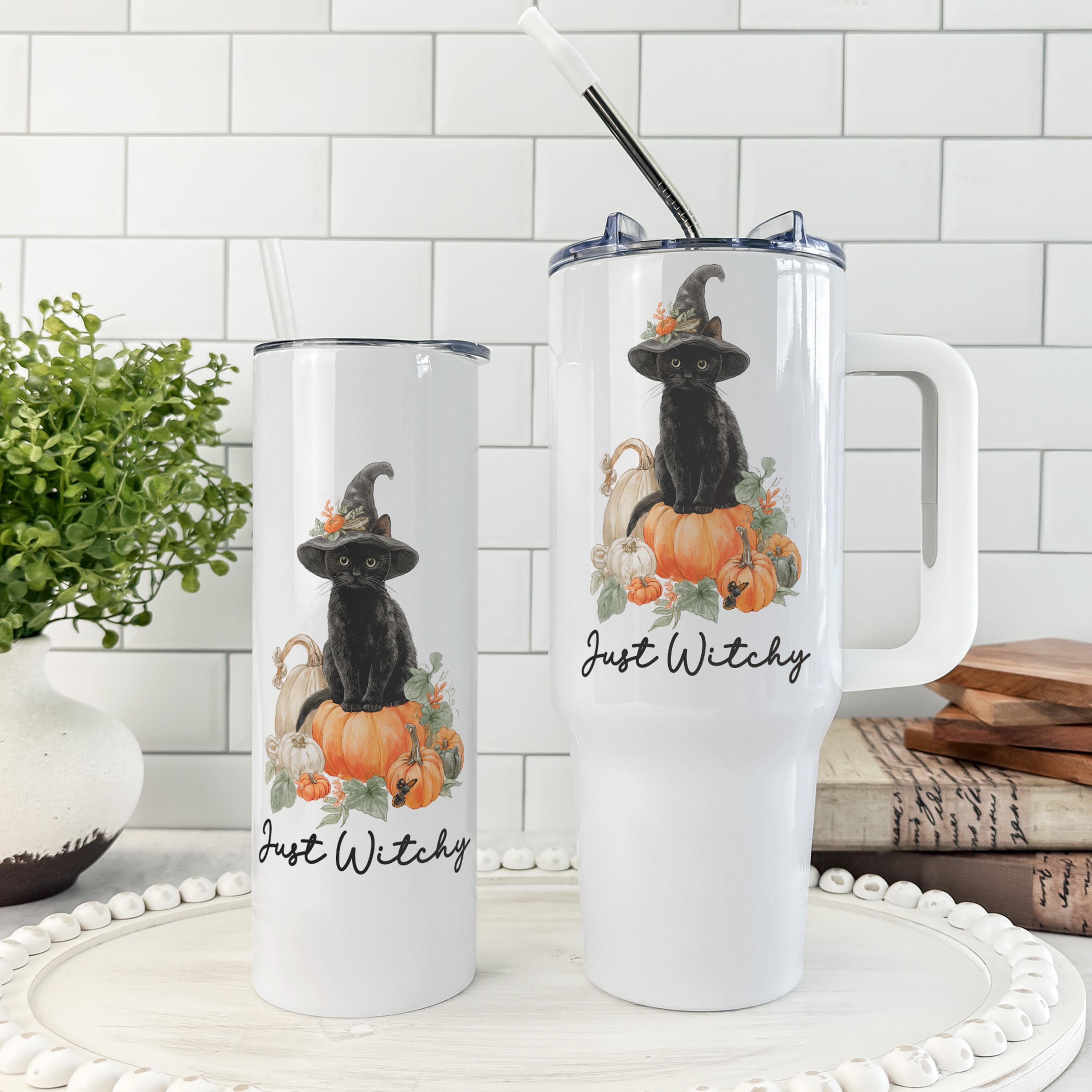 A charming witchy black cat tumbler features a black cat in a witch hat surrounded by pumpkins. This insulated cup (20 or 40 oz) is perfect for autumn. The design is printed on both sides. It’s dishwasher safe and made of food-grade stainless steel. The 40 oz version includes a detachable handle, screw-on lid with stopper, stainless straw, and cleaning brush. The 20 oz version has a sliding lid with seal and straw. The 20 oz cup fits most cup holders.