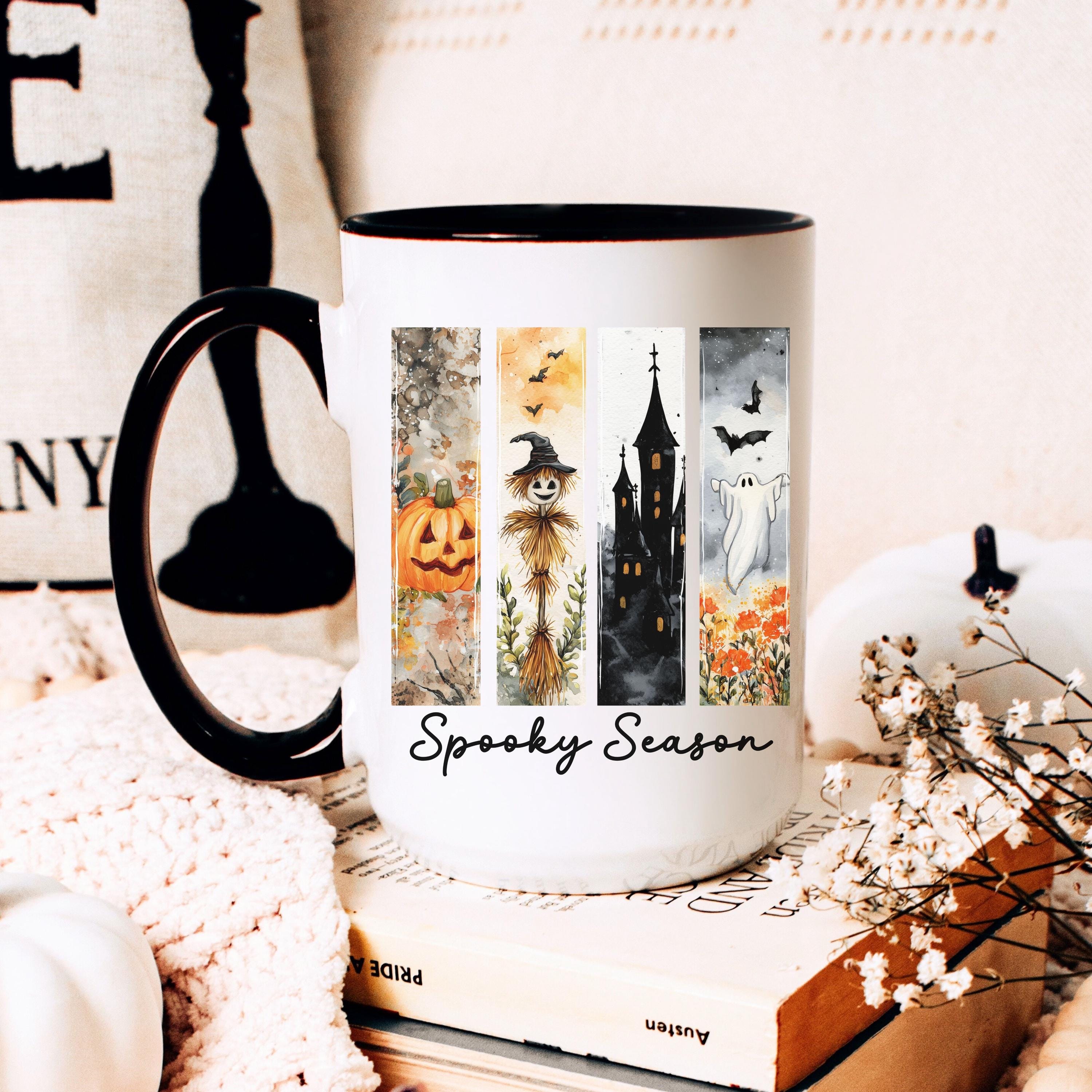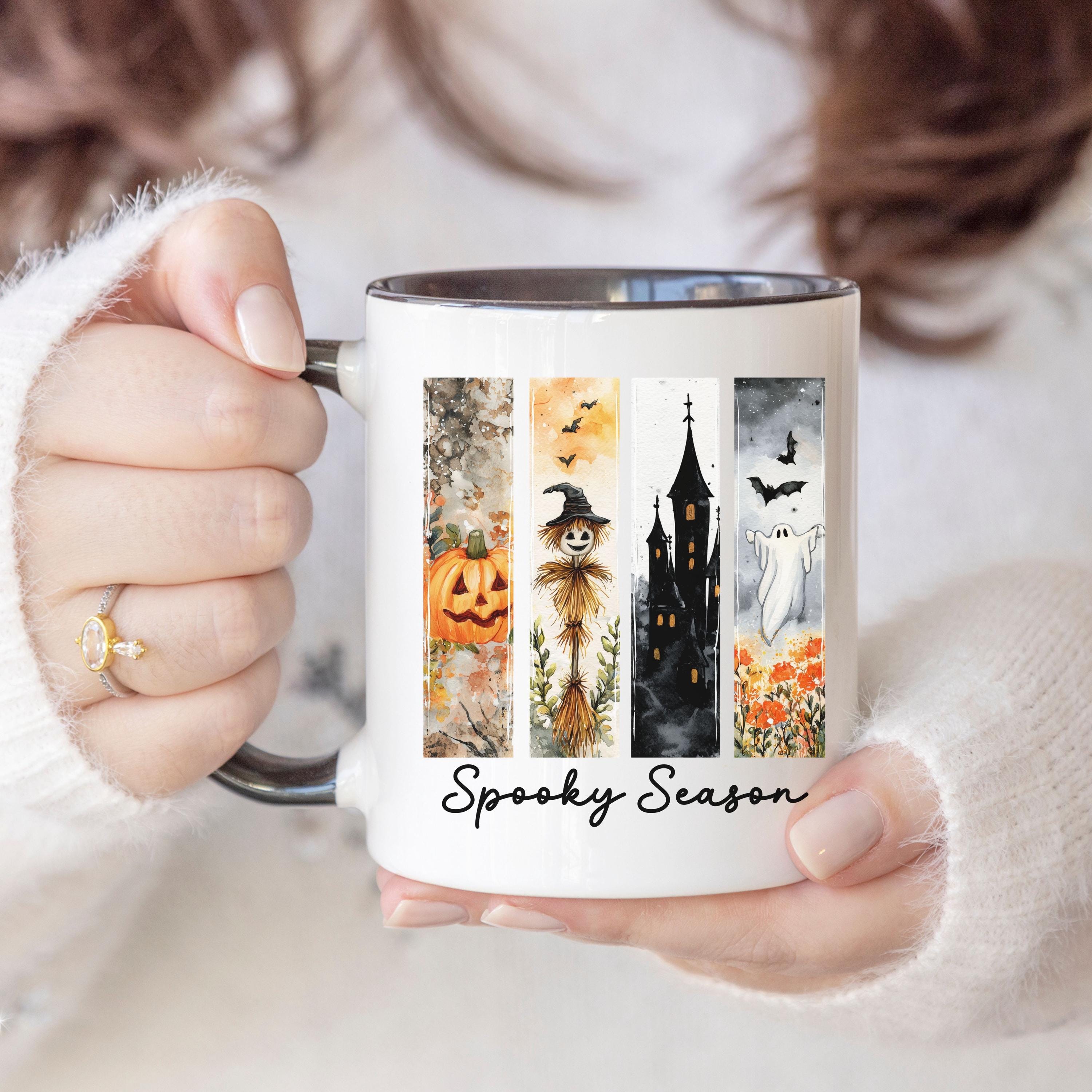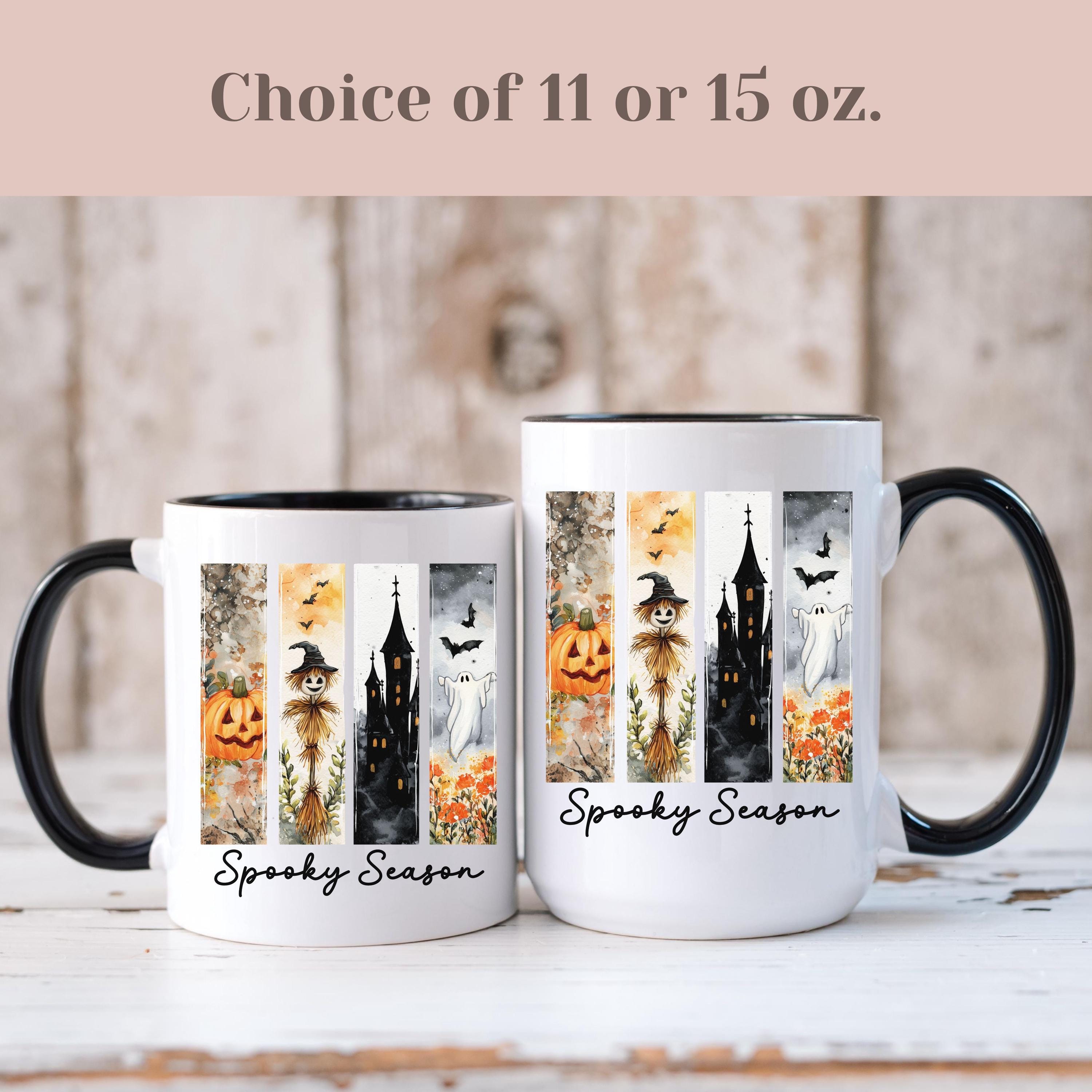 Spooky Season Halloween Mug, Halloween Coffee Ghost Mug, Jack O lantern, Scarecrow, Haunted House