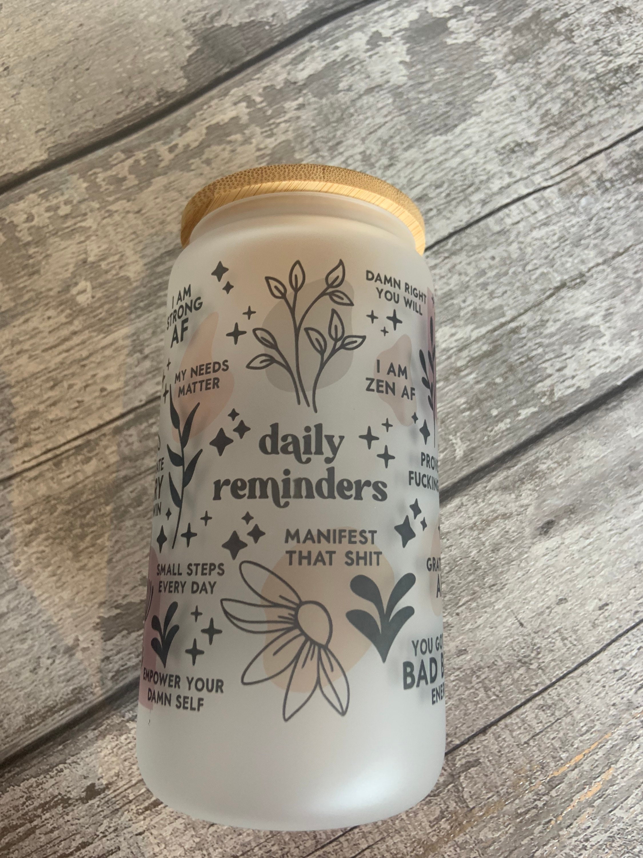 This 16oz sweary affirmations glass cup is a bold and uplifting way to start your day with a dose of humor and motivation. Perfect for iced coffee, tea, or any cold drink.