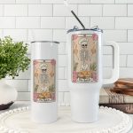 Pastel goth “The Baker” tarot card tumbler features a cupcake-juggling skeleton chef. Available in 20 or 40 oz. A unique gift for bakers and kitchen witches. Design printed on both sides. Dishwasher safe. Double-wall vacuum insulated. Individually boxed. 40 oz includes detachable handle, lid, straw, and cleaning brush. 20 oz includes sliding lid and straw. Skinny design fits most cup holders.