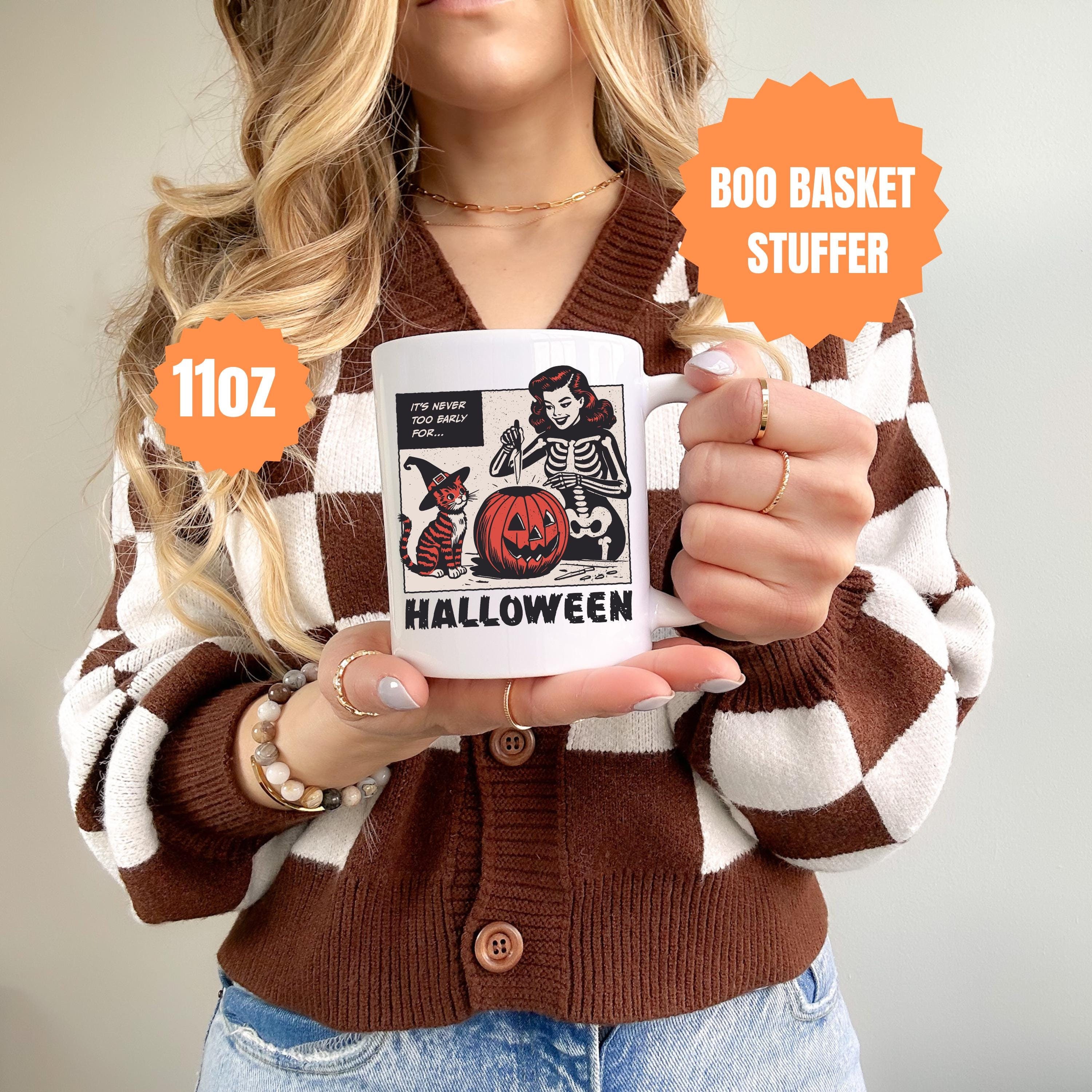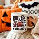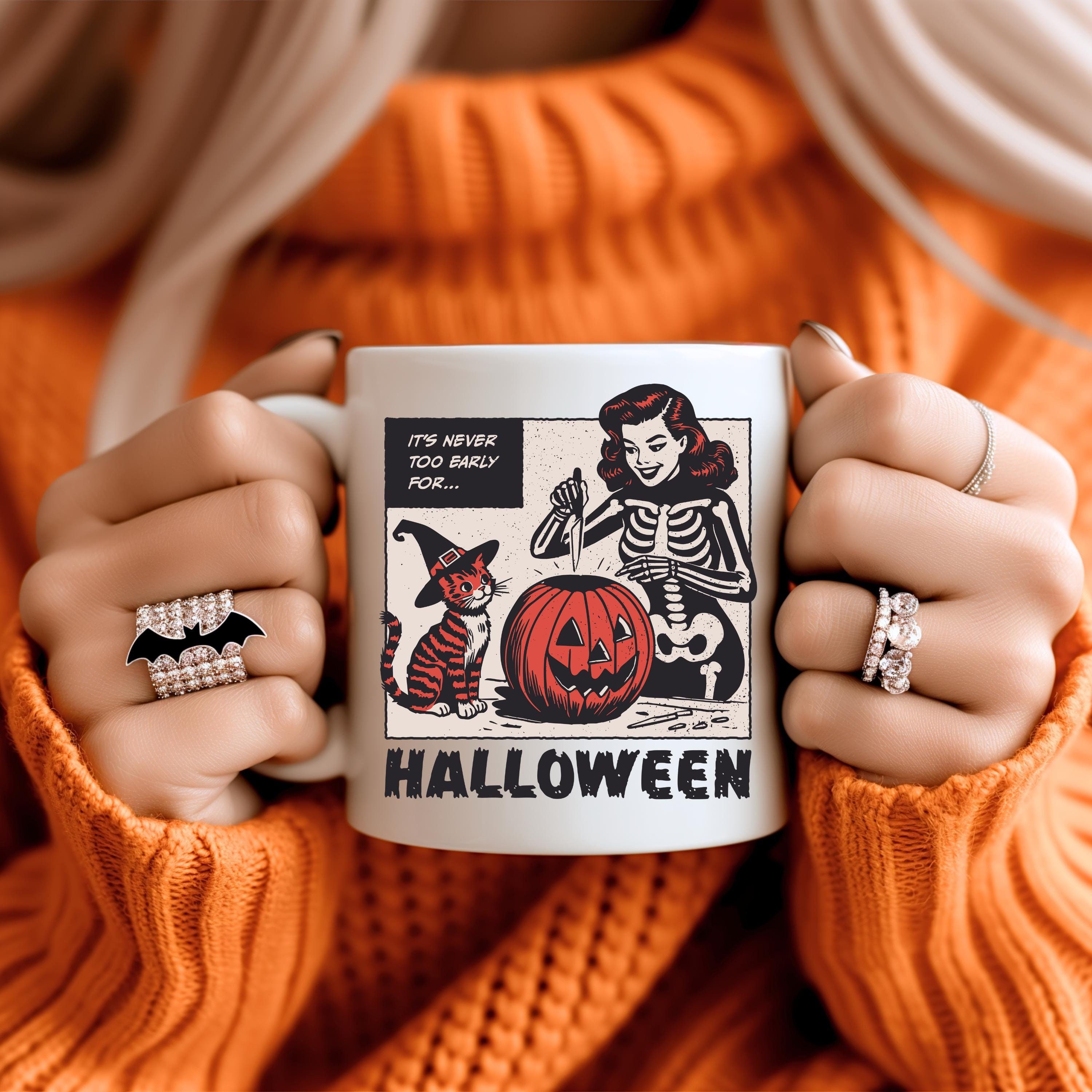 Start your fall mornings with a retro twist. This Halloween mug features a playful comic-style design with a skeleton, a witchy cat, and a classic Jack-o’-Lantern—perfect for spooky season enthusiasts and vintage lovers alike.