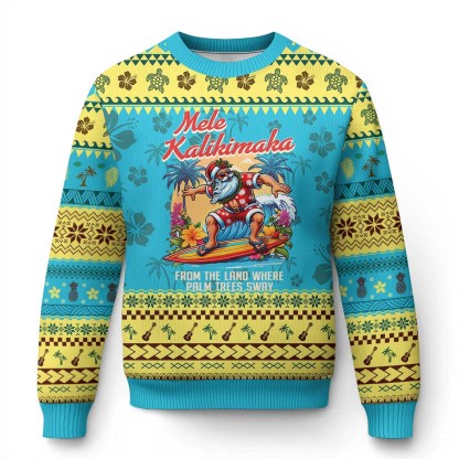 Xmas In Hawaii Ugly Christmas Sweater From The Land Where Palm Trees Sway Surfing Santa